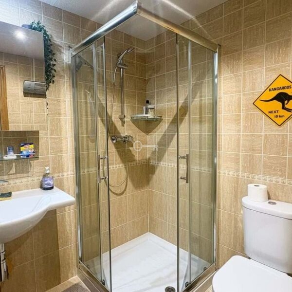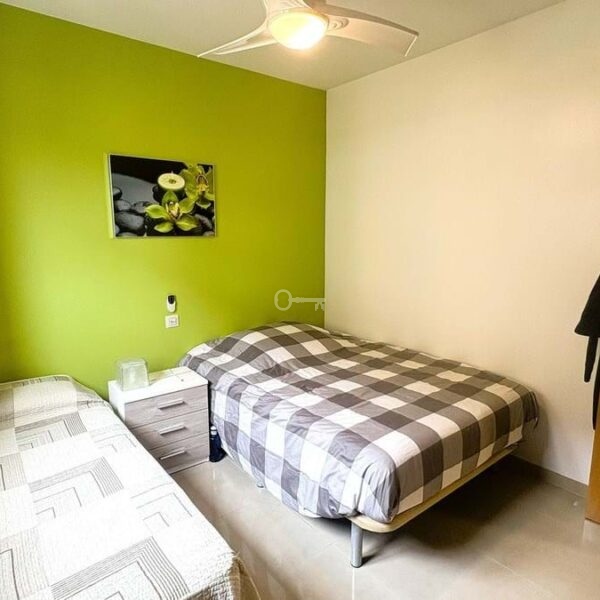 The master bedroom is a spacious double with fitted wardrobes and direct access to the terrace via patio doors. It also features a full en-suite bathroom. The guest bedroom is also generously sized and includes fitted wardrobes. A second bathroom is fitted with a contemporary walk-in shower.
