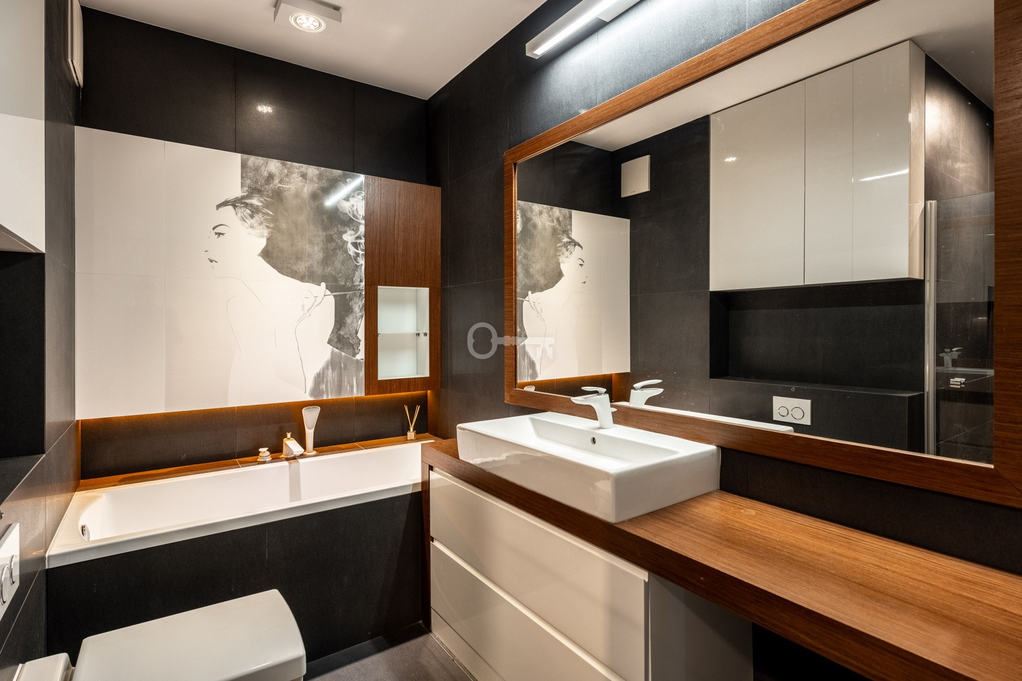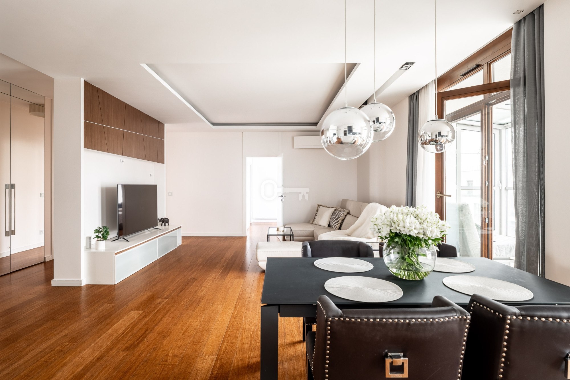 The apartment is finished to a high standard, with attention to every detail. The highest quality materials have been used — natural wood floors and elegant ceramics and fittings from renowned manufacturers in the bathrooms.
