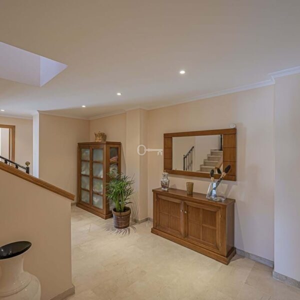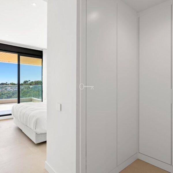 The interior layout features a bright living room, a dedicated dining area, and a guest room, all complemented by high-quality finishes such as double glazing and underfloor heating in the bathrooms. The kitchen is supported by a utility and laundry room, while fitted wardrobes and a storage room provide ample space for organisation. Comfort is ensured with individual air conditioning units, aerothermics, and fibre optic internet, while security is prioritised with a 24-hour alarm and security service.