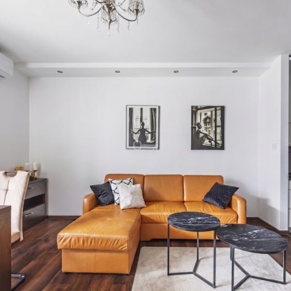 The apartment is fully equipped with electronics and appliances and ready for immediate move-in. A complete set of new furnishings awaits the tenant, including bedding and towels, a dinner service, and a full set of cookware. Additional amenities include a second TV in the bedroom, air conditioning, and other features that enhance everyday comfort.