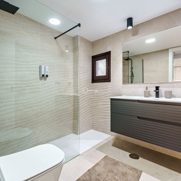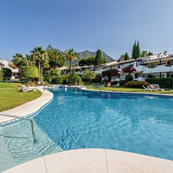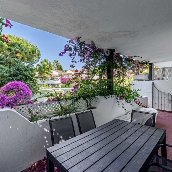 This magnificent ground floor apartment is located in Vivero de Marbella, a quiet, low-rise residential complex in the prestigious Sierra Blanca area on Marbellas Golden Mile, between Imara and Le Blanc. Recently renovated with high-quality materials, the apartment offers a modern open-concept layout. It features a fully equipped kitchen with a breakfast bar and a bright living-dining area that opens onto a cozy terrace with outdoor sitting and dining areas and direct access to the communal garden. The master bedroom includes an en-suite bathroom and access to a private balcony, while the other two bedrooms share a bathroom. All bedrooms have built-in wardrobes, and there is also a practical separate laundry room. The complex is very well maintained and offers beautiful gardens with water features, a swimming pool, and communal parking. Its an ideal place to enjoy peace and comfort in one of Marbellas most exclusive areas. With a tourist license in place, the property presents an excellent investment opportunity.