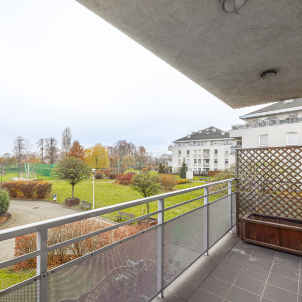 SPACIOUS APARTMENT WITH LARGE BALCONY AND VIEW OF GREENERY.