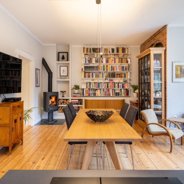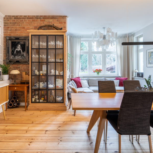 The apartment is located on the high first floor of a renovated building to which belongs a large garden – a green space giving the opportunity to fully relax with the surrounding forest.