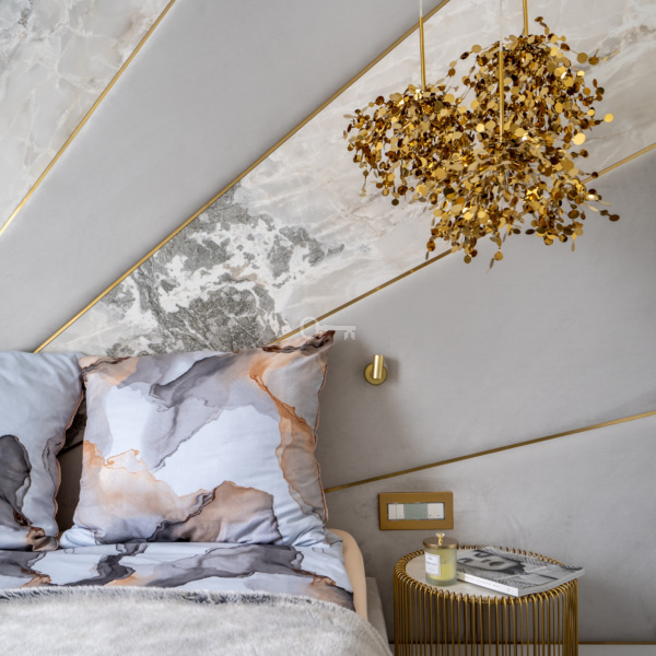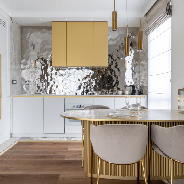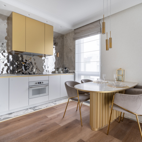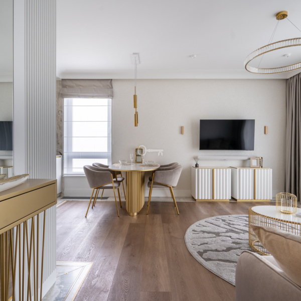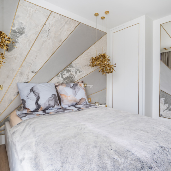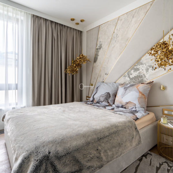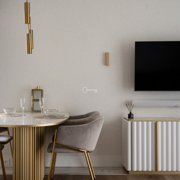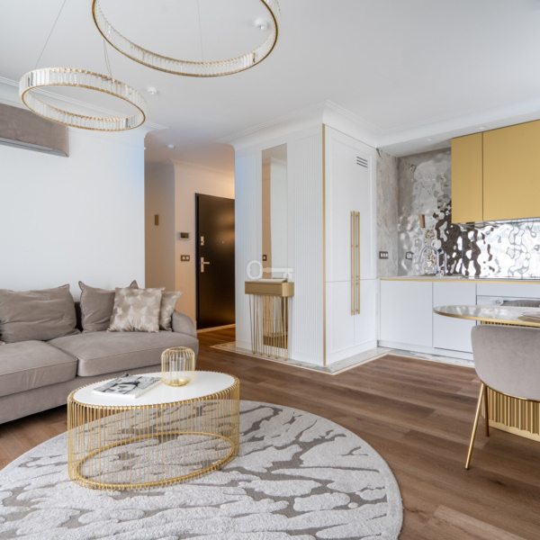 The living area is divided into a relaxation zone with a comfortable fold-out sofa, a TV console and coffee table, and a kitchen-dining area with a table for four. The kitchenette, harmonizing with the room’s design, is furnished with elegant white, gray, and gold cabinetry and equipped with high-end appliances (induction hob, dishwasher, fridge-freezer, oven, hood). The cozy and comfortable bedroom, featuring a large double bed, is perfect for relaxation after an eventful day. The functional and stylish bathroom includes a large shower, ideal for a refreshing morning start. A spacious built-in wardrobe is installed in the hallway. Wooden flooring, elegant lighting, and unique decor accents add warmth and sophistication to the interior.