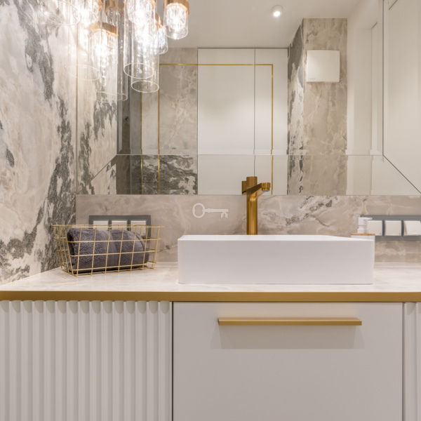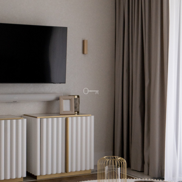 The apartment was professionally designed with careful attention to detail. Finishes are tasteful, with custom-made furniture crafted from high-quality materials. Every element is in harmony, providing a cohesive and elegant color palette.