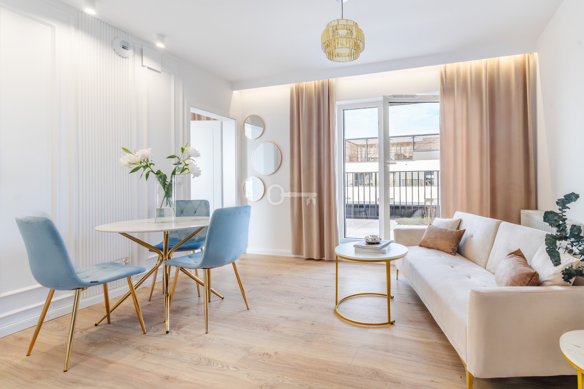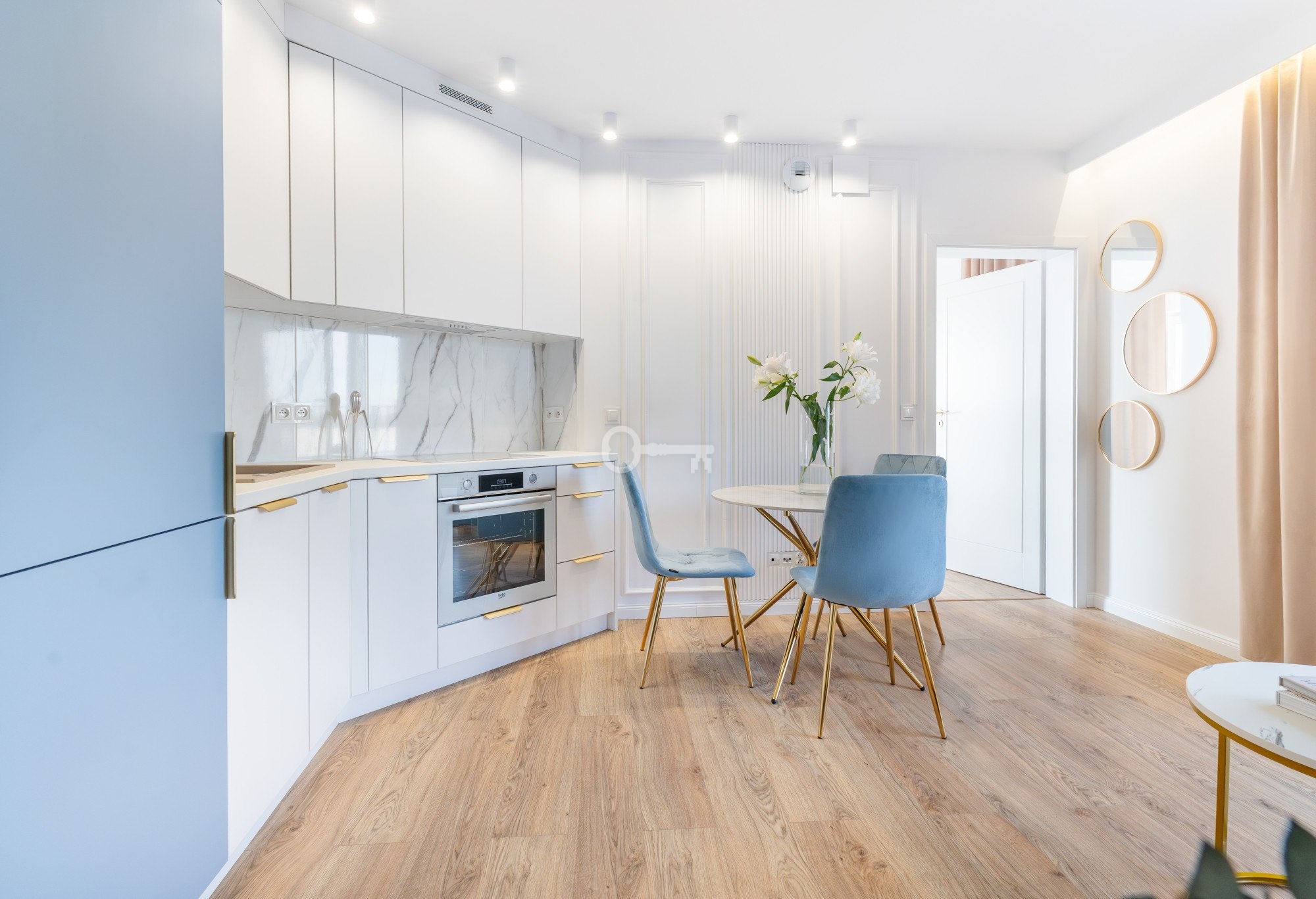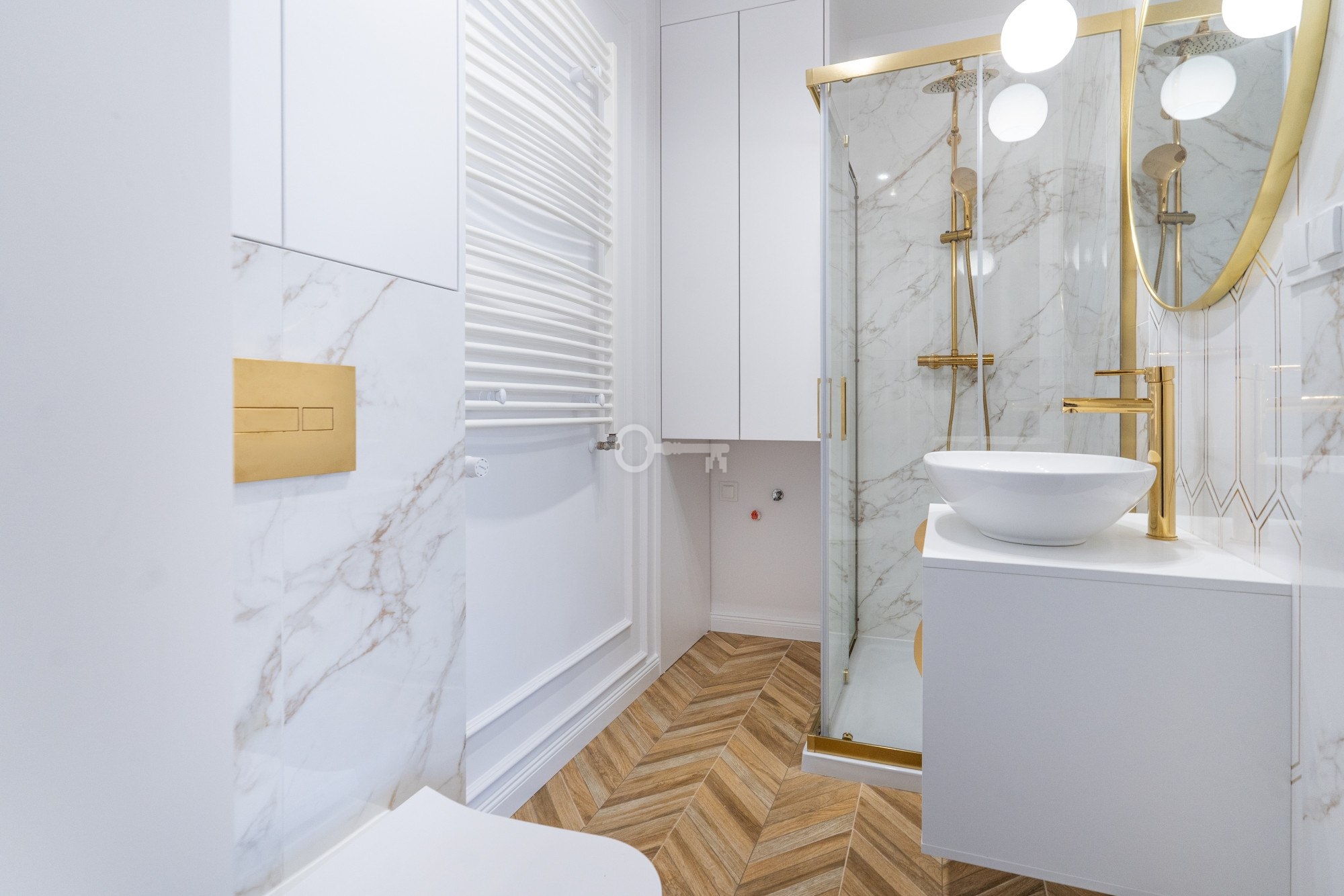 The apartment has been finished to a high standard according to the design of an experienced interior designer. The interior is decorated in a glamour style – dominated by light colors, soft fabrics, and subtle golden accents. Custom-made furniture by a carpenter (kitchen cabinets and wardrobes in the hall) allows you to fully utilize the space and maintain aesthetic consistency.