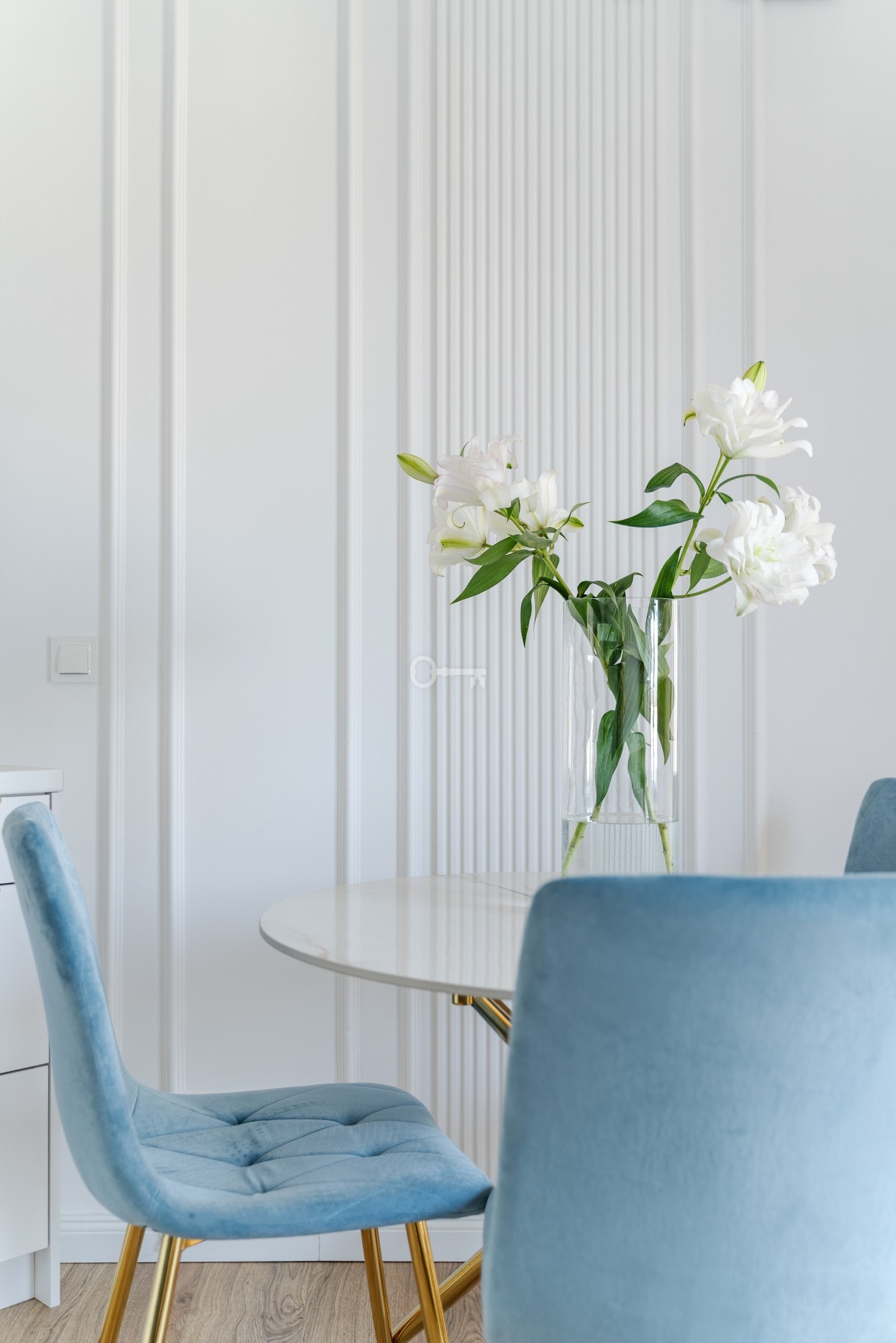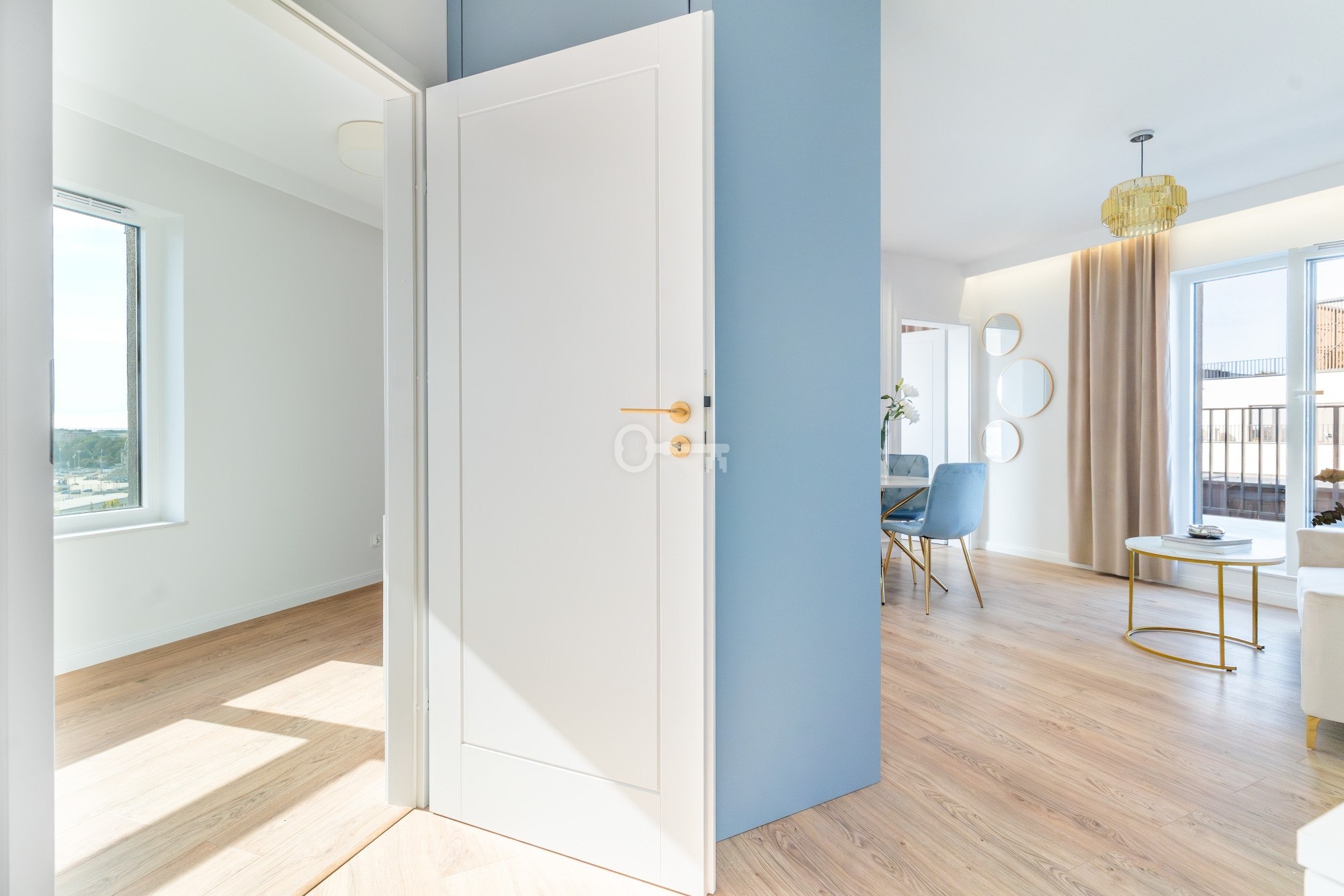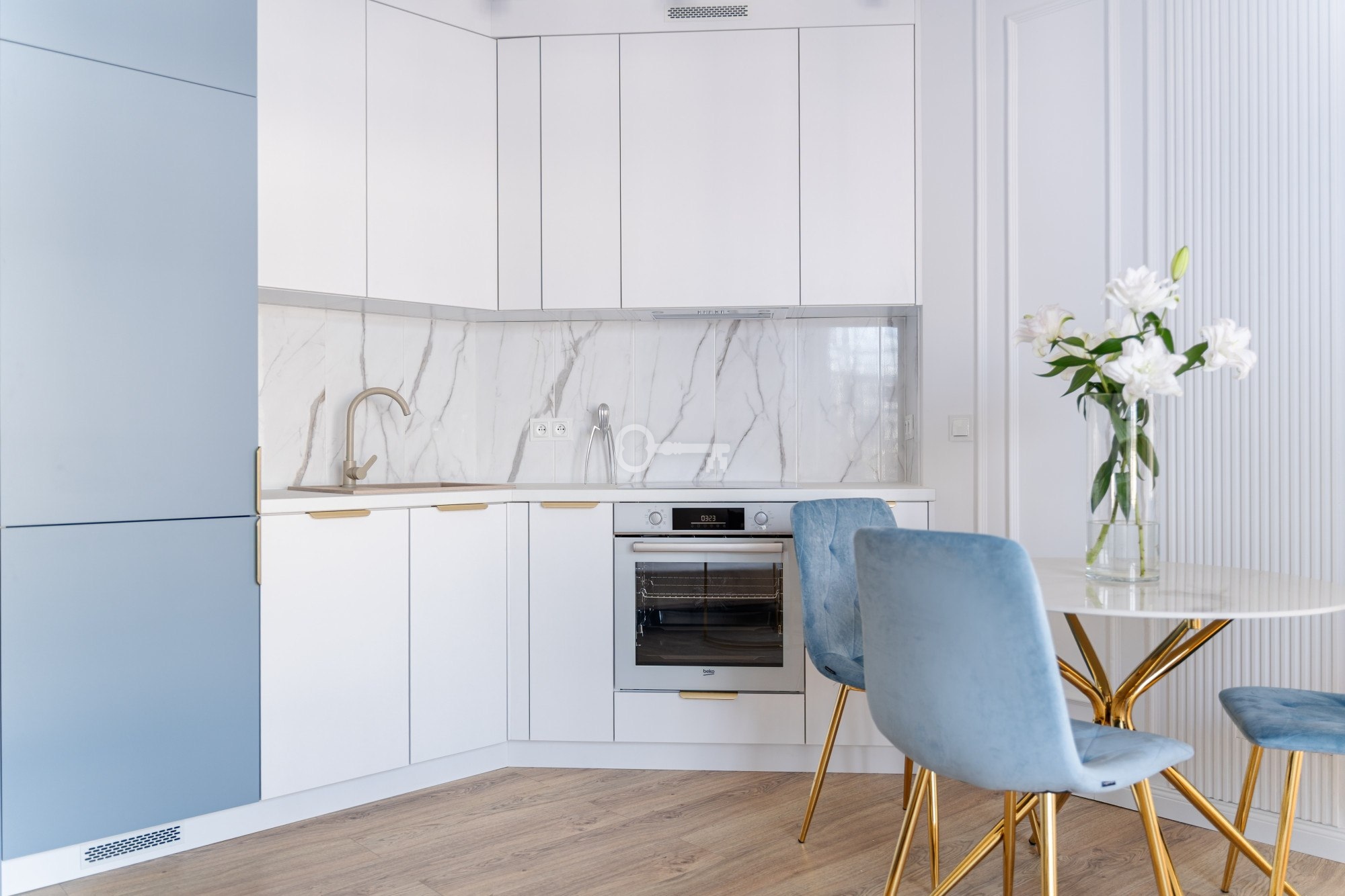 The apartment has been finished to a high standard according to the design of an experienced interior designer. The interior is decorated in a glamour style – dominated by light colors, soft fabrics, and subtle golden accents. Custom-made furniture by a carpenter (kitchen cabinets and wardrobes in the hall) allows you to fully utilize the space and maintain aesthetic consistency.