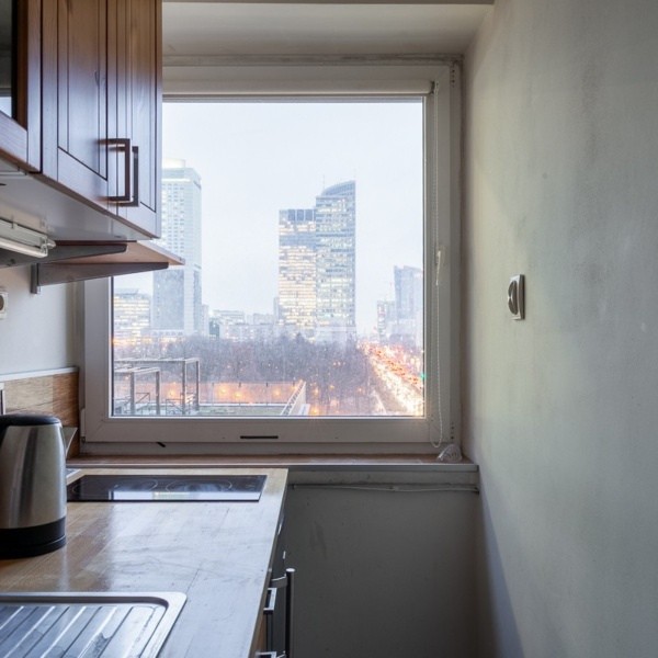 The flat is located on the 5th floor, 24 storey building. The windows offer a unique view of the center of Warsaw. Renovated entrance to the building with a porter’s lodge and 2 lifts.