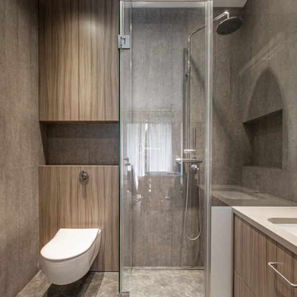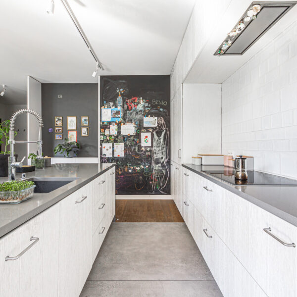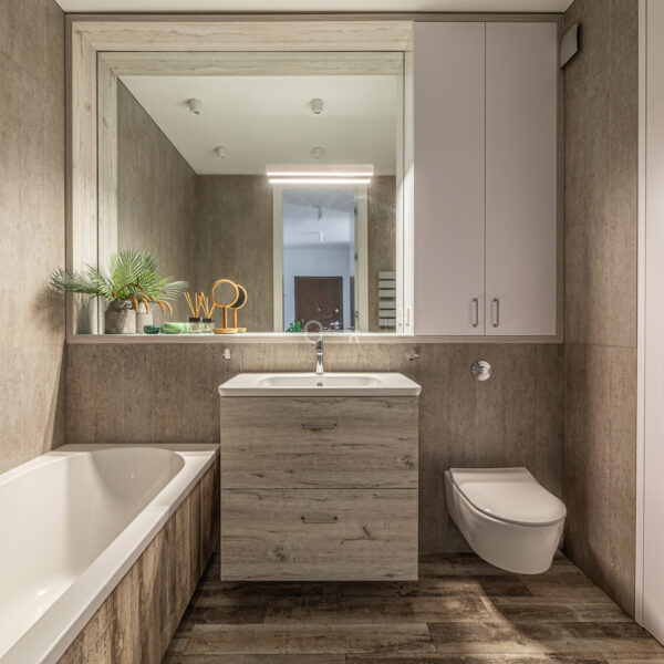 Wooden floors, high interior doors, stone finish of the bathrooms, kitchen with a large island – all these elements make the apartment very stylish and cozy. In addition, the orientation of the living room to the south and the bedrooms to the north guarantee the comfort of daily life.