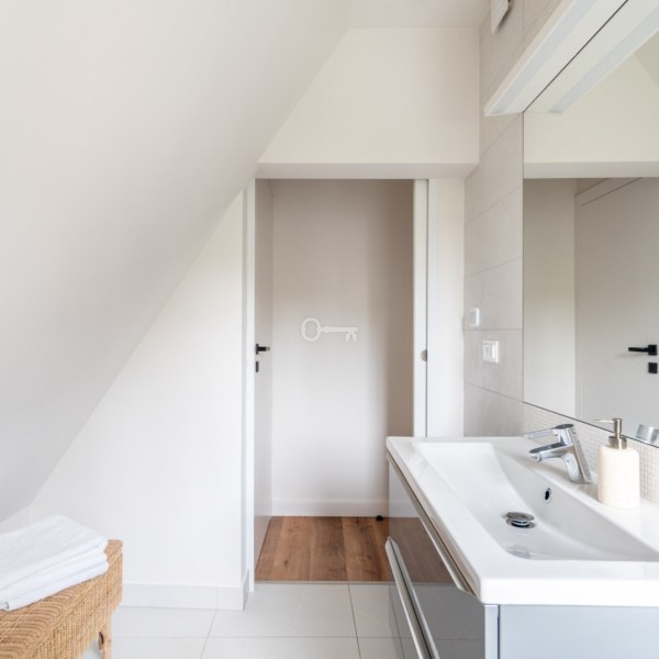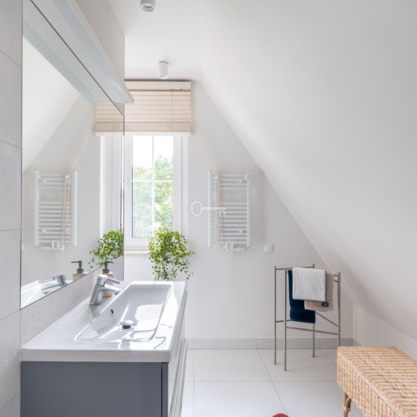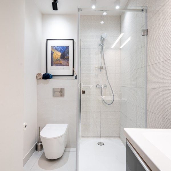 Functionally, the property is divided into a dry and wet zone – on the south-west side there are: the living room and bedroom; on the north-east side – in the wet zone – there is the kitchen and two bathrooms. Thanks to openings on both sides, proper air circulation is ensured. An additional advantage of the bedroom is the close location of the bathroom and the dedicated walk-in closet accessible directly from the bedroom. Air conditioners in the living room and bedroom make the south-facing leisure zone comfortable even during the hottest days.