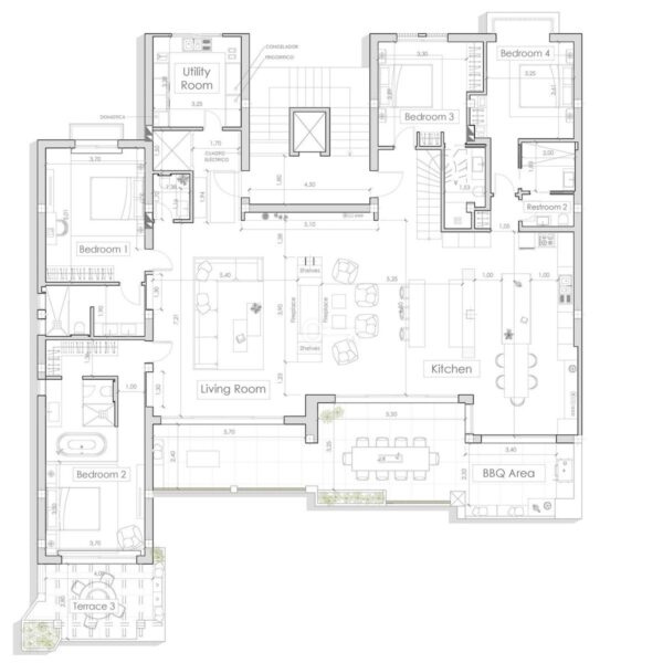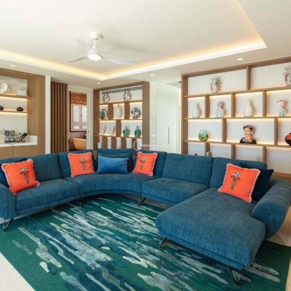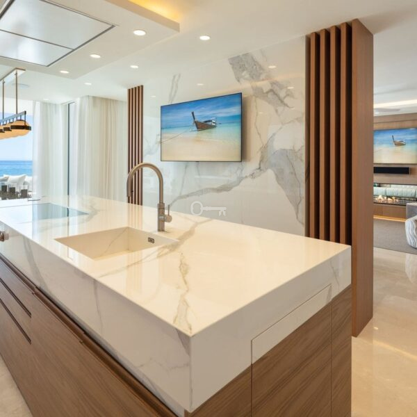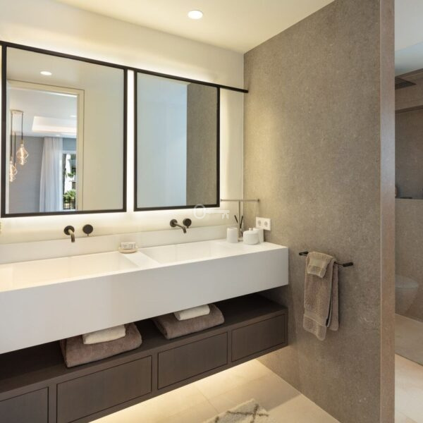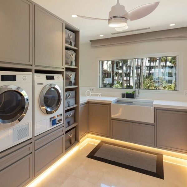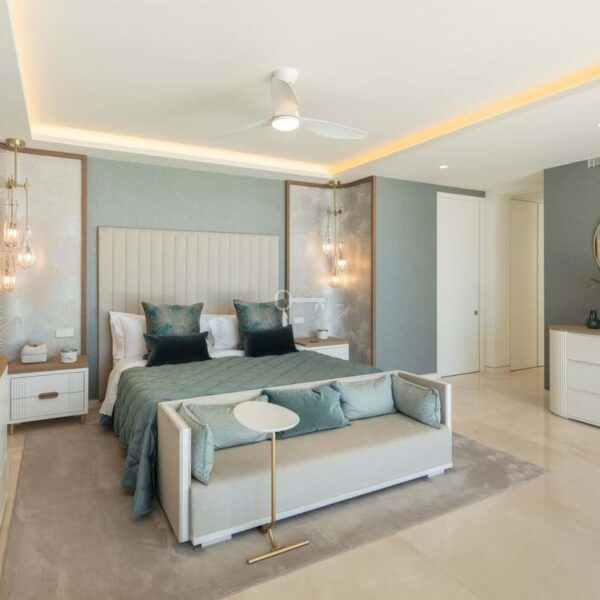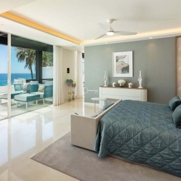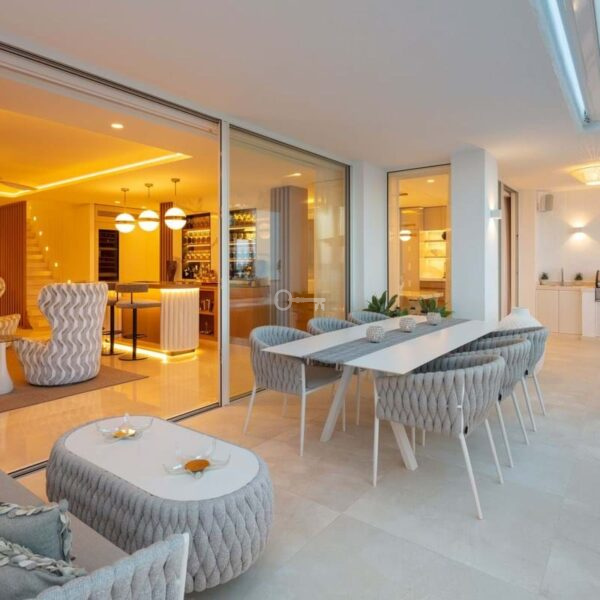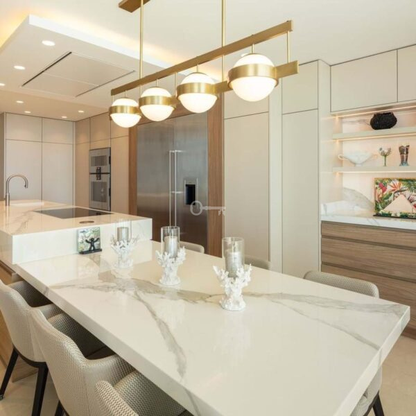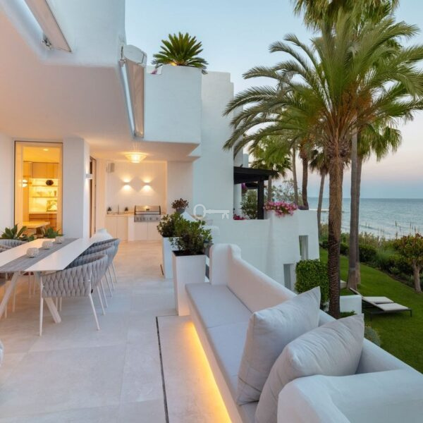 Built in complete harmony the seamless indoor/outdoor flow creates resort-style relaxation combined with inviting entertainment spaces. Boasting an impressive 454 m2 build size and 211 m2 of terraces, every space has been finished to the highest specification using natural elements and sophisticated furniture. Spanning over two levels this opulent beachfront apartment features six en-suite bedrooms with every corner of the property being thoughtfully curated. This impressive apartment opens up to two living areas, one with an ample bar perfect for entertaining and the other a place to relax on luxurious seating while each staying true to the style. Enjoy the Mediterranean weather on the spacious terraces with outdoor cooking area flooded with light and the sounds of the ocean. The state-of-the-art kitchen features Gaggenau and Miele appliances such as American fridge/freezer, integrated oven, and wine cooler along with ample storage space. The dining table has been perfectly integrated and allows each diner to enjoy the incredible sea views. The property also benefits from a separate laundry room with Miele washer and dryer, overflow fridge/freezer, and butler sink.