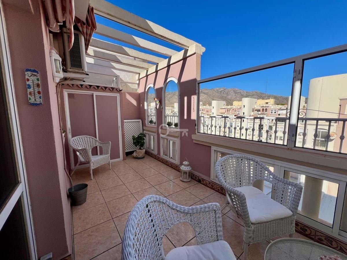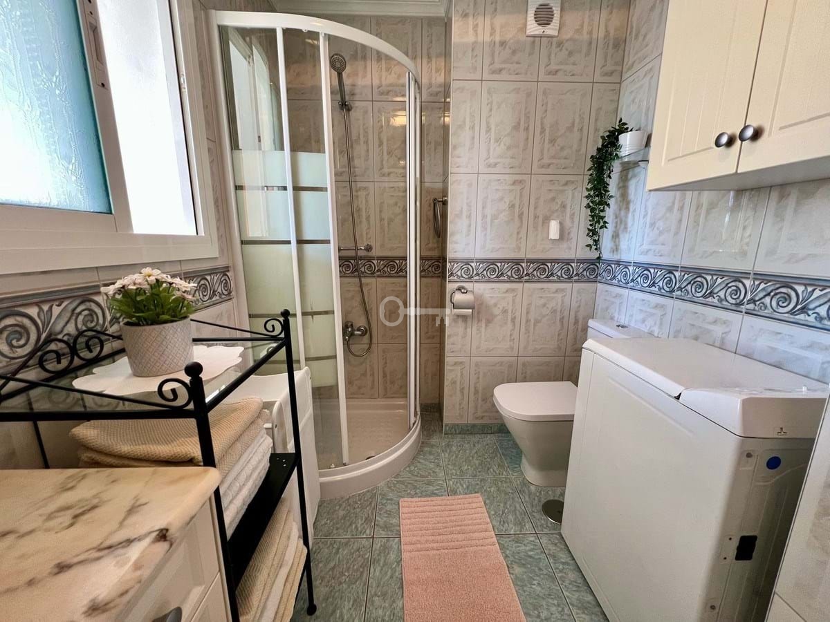 The layout includes a comfortable living and dining area, a compact kitchen, one bathroom, and a main bedroom. A section of the terrace has been enclosed and is currently used as a practical guest room, providing extra sleeping space or an ideal spot to work from home.