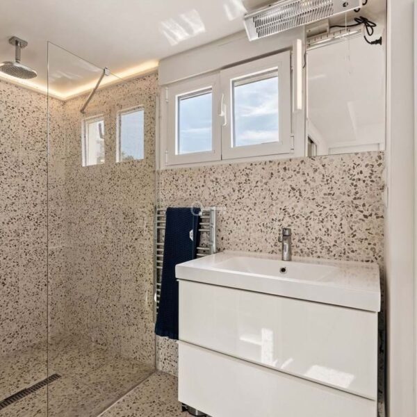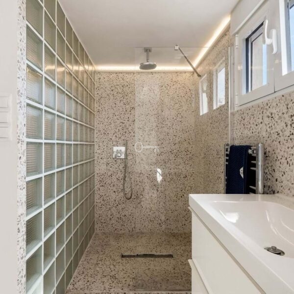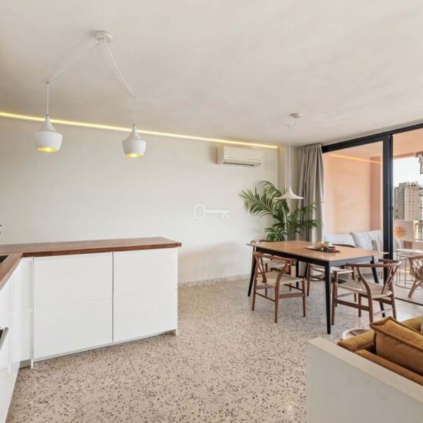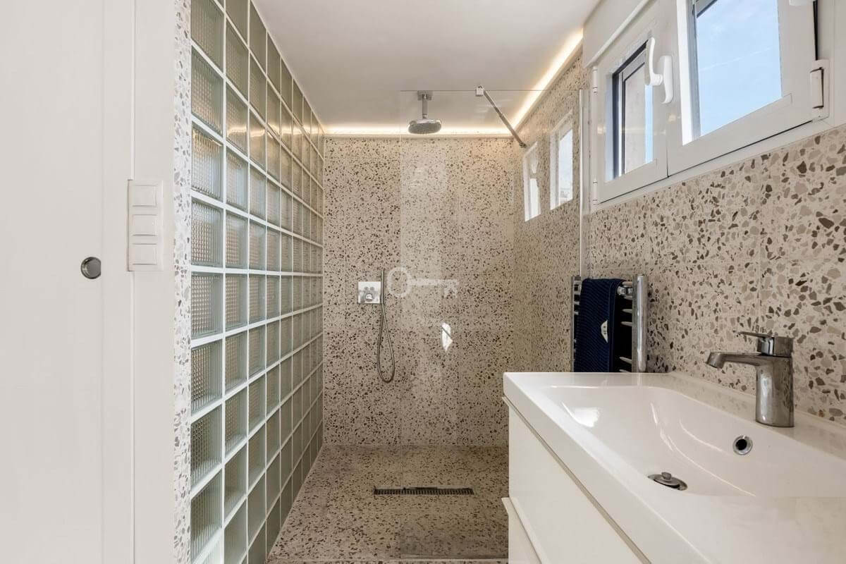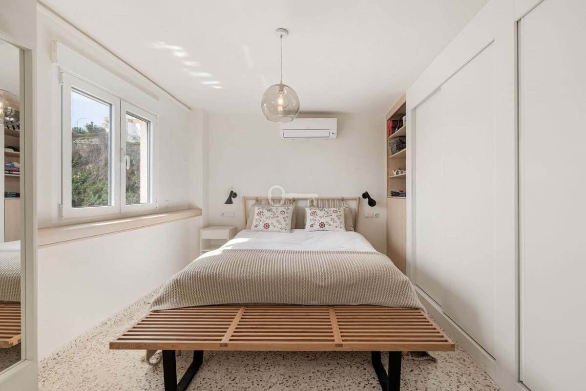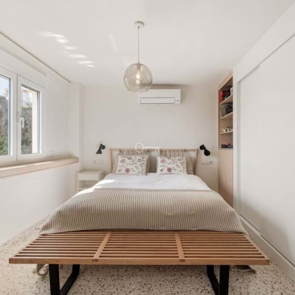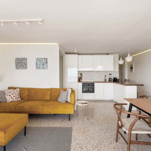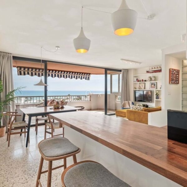 The heart of the home is the exceptionally spacious living room, which opens directly onto a large terrace with panoramic sea views. Thanks to its wide sliding glass doors and excellent orientation, the space is flooded with natural light and offers seamless indoor-outdoor living. From the terrace you can enjoy stunning views of the Mediterranean and the surrounding coastline.