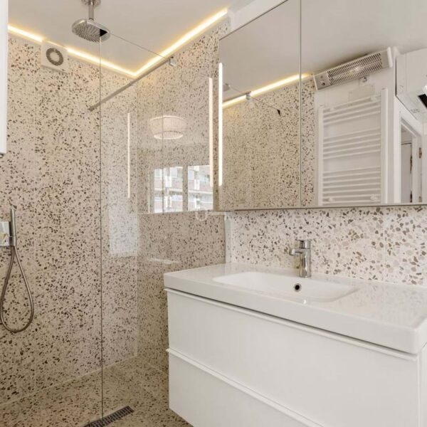The property features two comfortable bedrooms, each with its own private shower, providing privacy and convenience for residents and guests alike. In addition, the apartment benefits from a separate Japanese-style toilet, adding practicality to the layout.