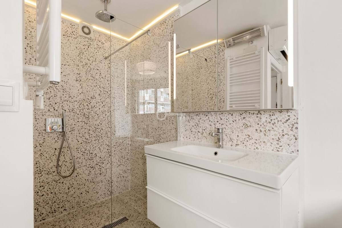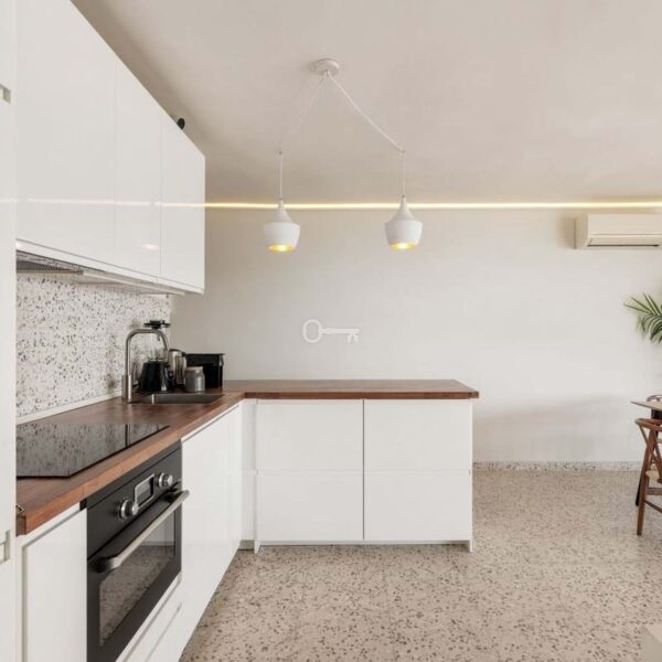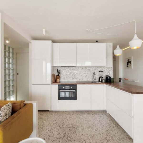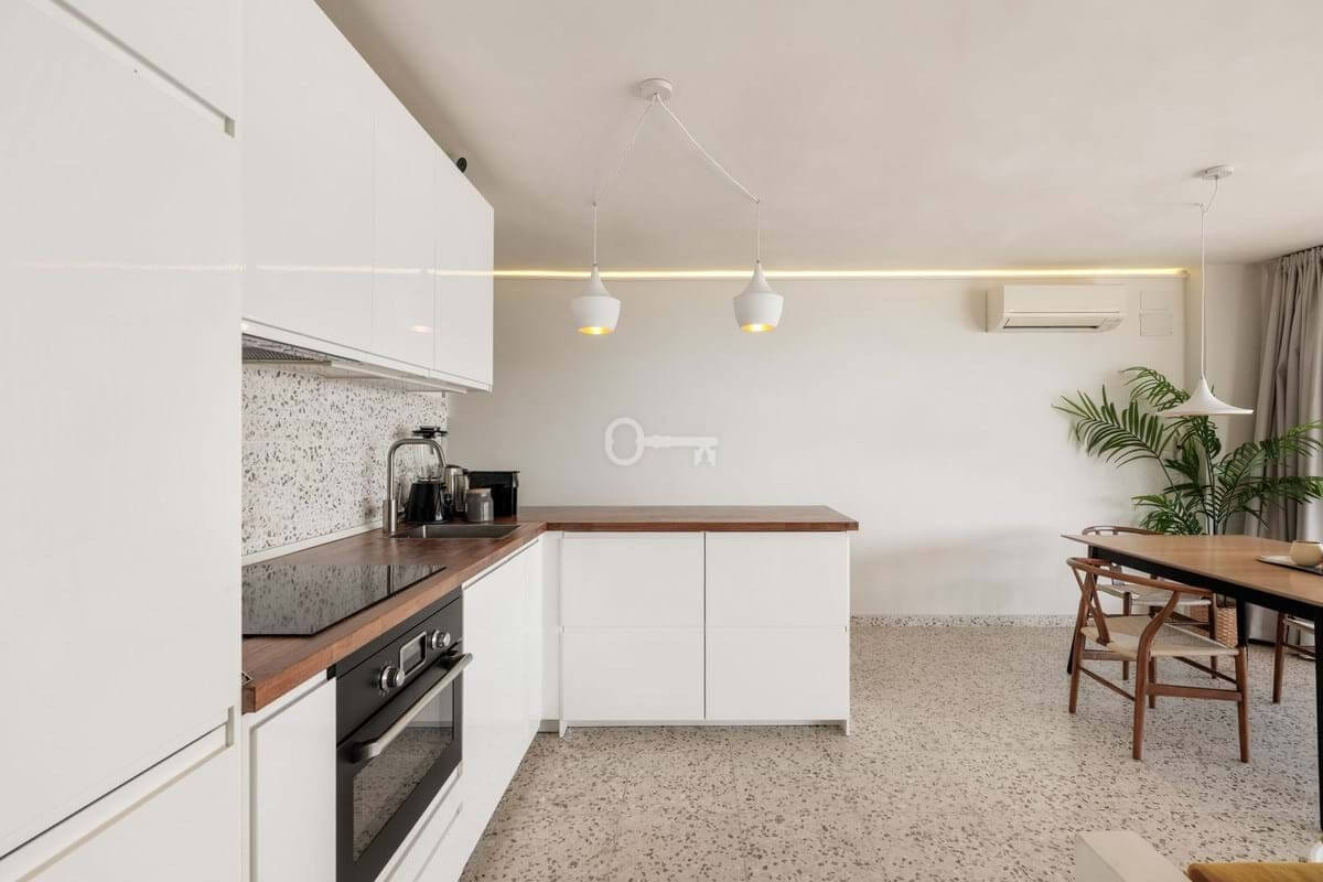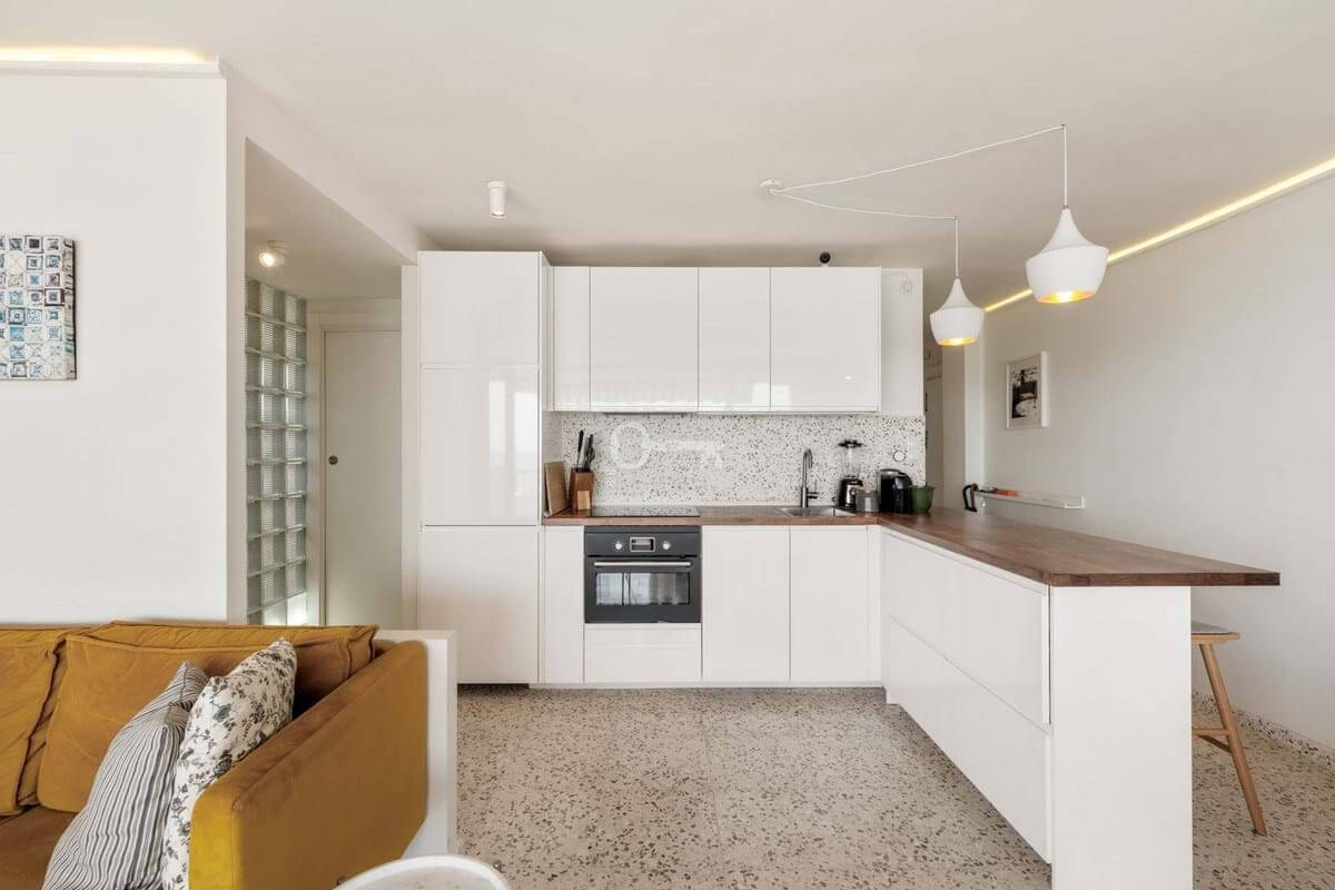 The open-plan kitchen integrates perfectly with the living area, creating a bright and social space ideal for both everyday living and entertaining.