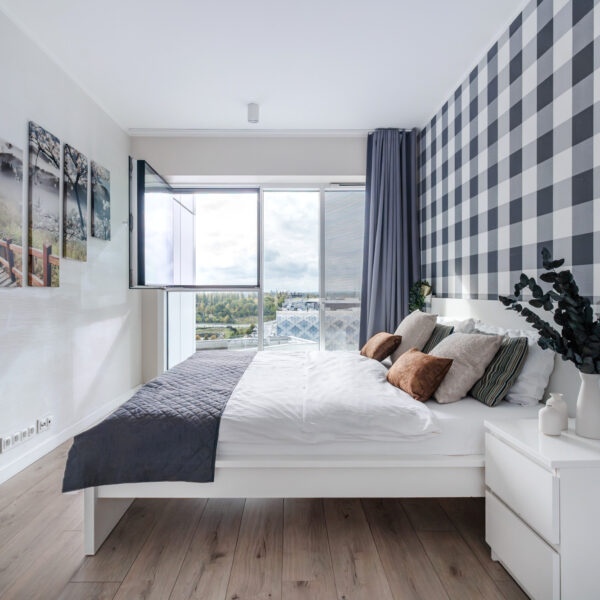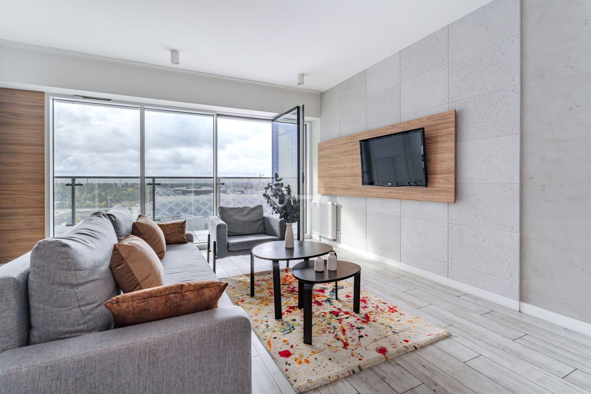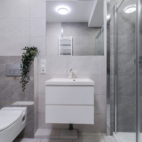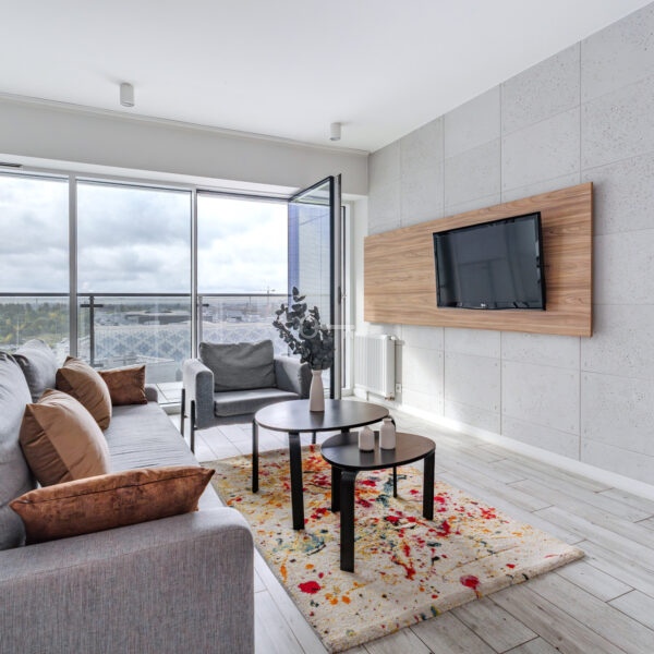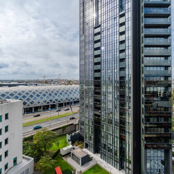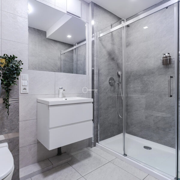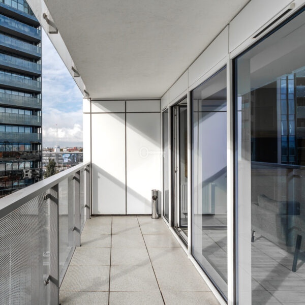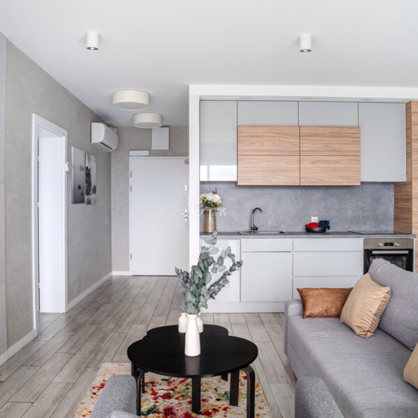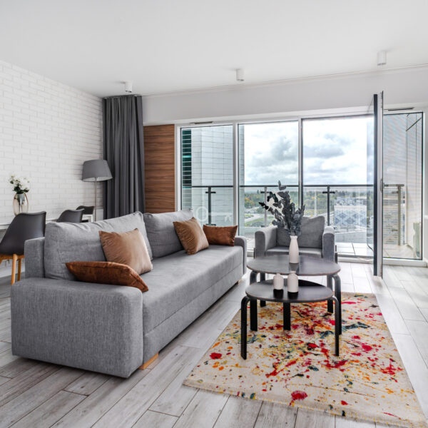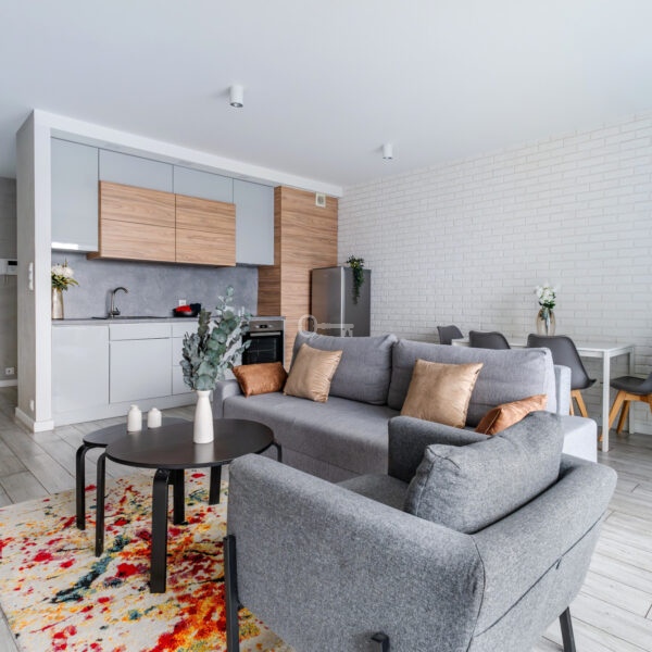 The interior has been designed with attention to every detail – an elegant living area with panoramic windows creates a space full of light and energy. The balcony offers a view of the bustling city center. The apartment is finished to a high standard – wooden panels on the floors, custom-made kitchen furniture with full appliances (refrigerator, dishwasher, oven, hob, washing machine). The bathroom features high-quality tiles and fittings, and large windows provide natural light throughout the day.