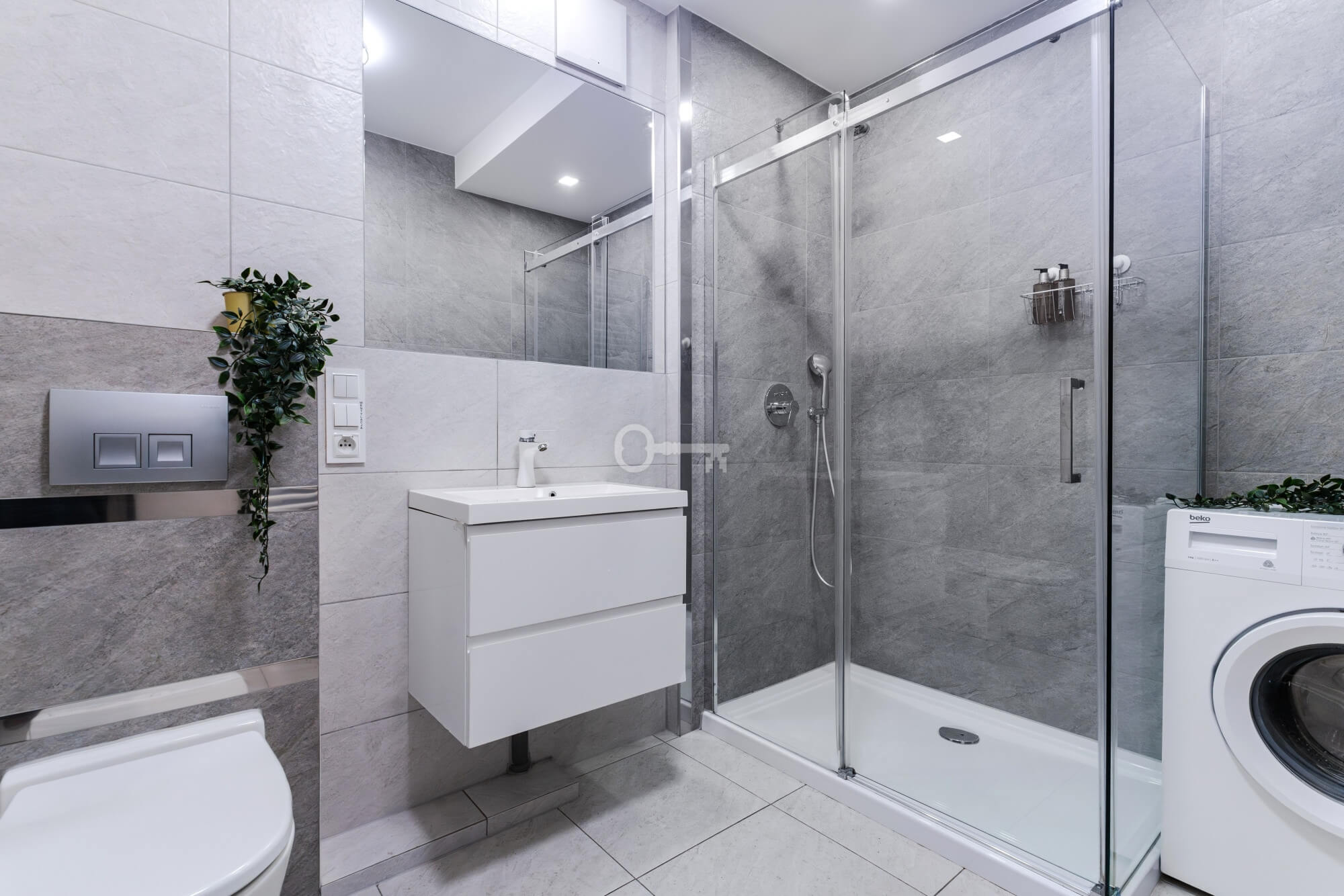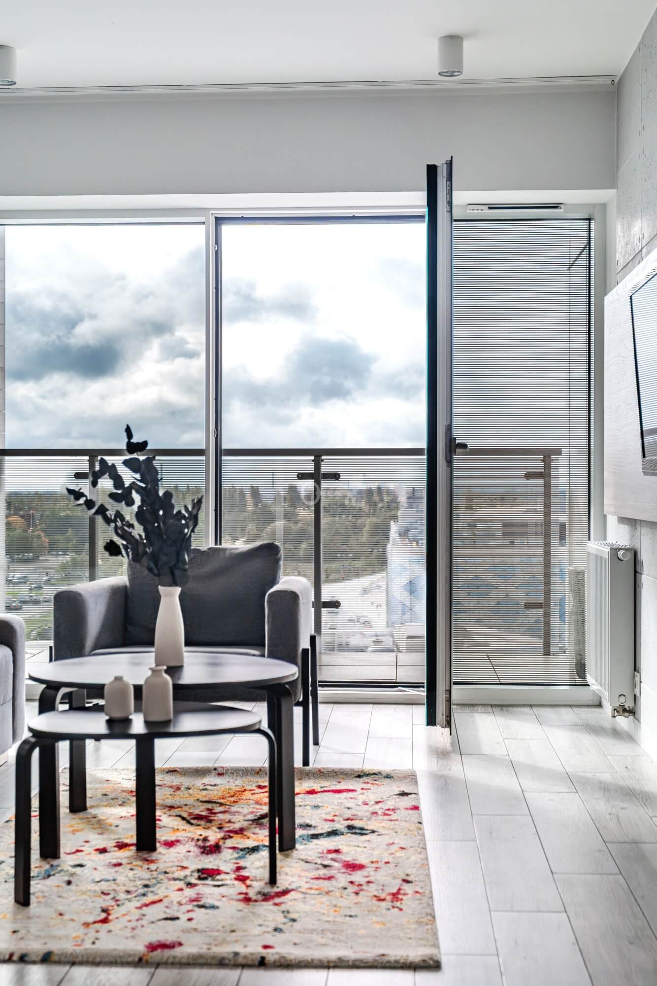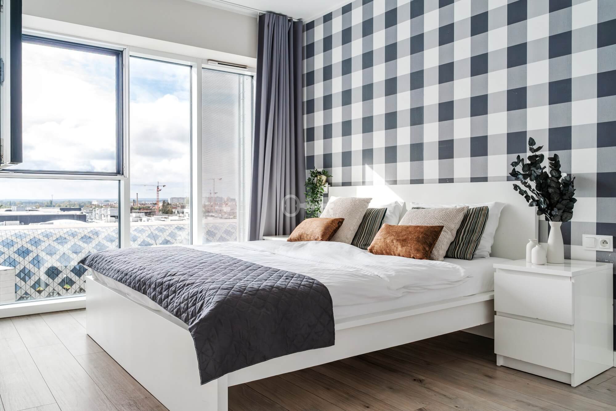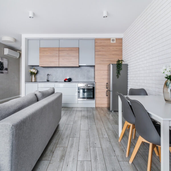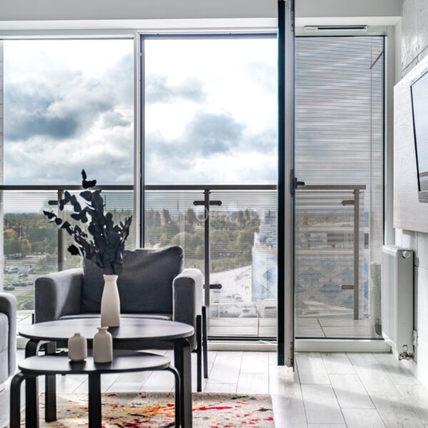 The interior has been designed with attention to every detail – an elegant living area with panoramic windows creates a space full of light and energy. The balcony offers a view of the bustling city center. The apartment is finished to a high standard – wooden panels on the floors, custom-made kitchen furniture with full appliances (refrigerator, dishwasher, oven, hob, washing machine). The bathroom features high-quality tiles and fittings, and large windows provide natural light throughout the day.