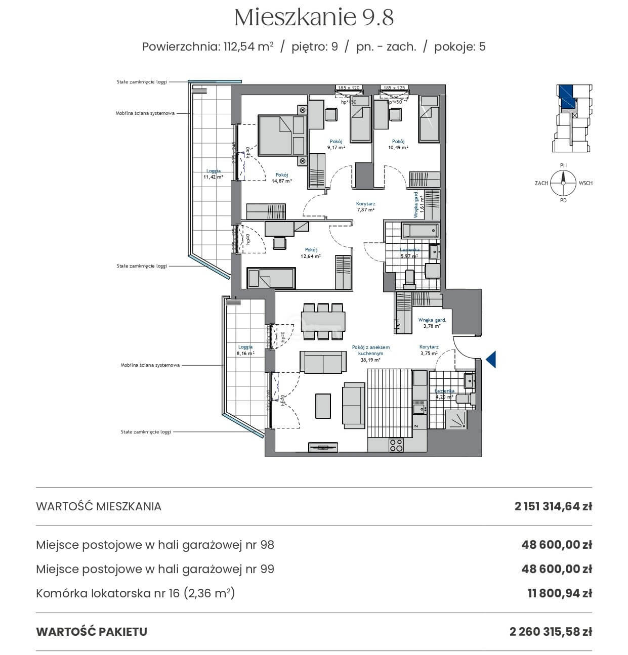 The apartment with an area of 126.09 m2, located on the tenth floor, with a southwestern exposure, consists of: