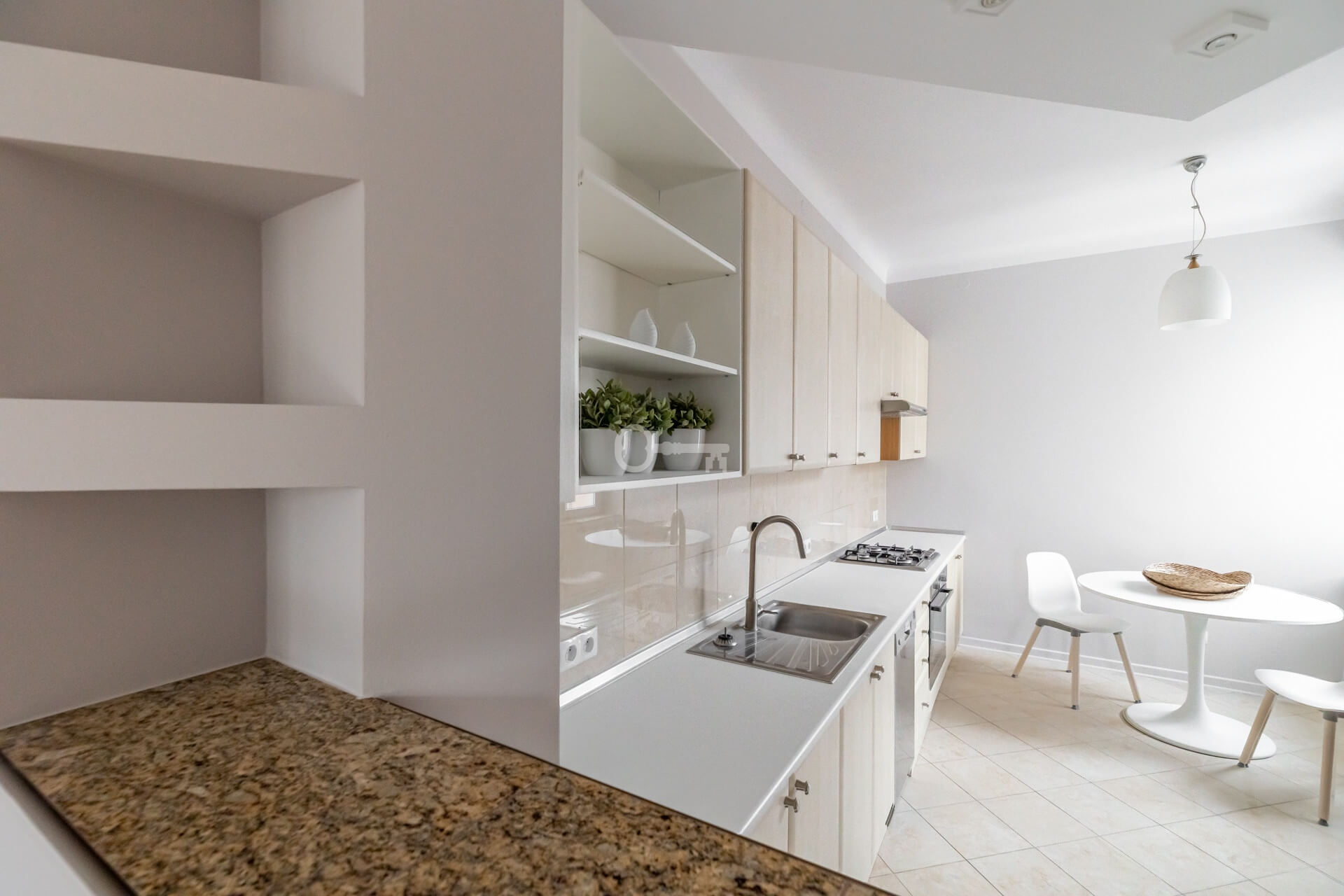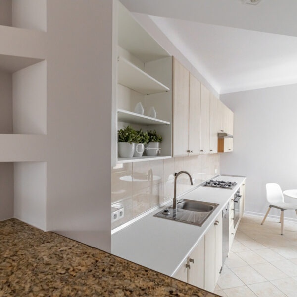 The interiors are decorated in a light color scheme of beiges, whites and grays. On the floors there is a wooden parquet floor. The bright bathroom, which is located next to one of the rooms, has a bathtub, shower, bidet, toilet and two sinks. Every room is filled with natural light, due to large windows. The kitchen is equipped with the necessary appliances: gas stove, oven and dishwasher.