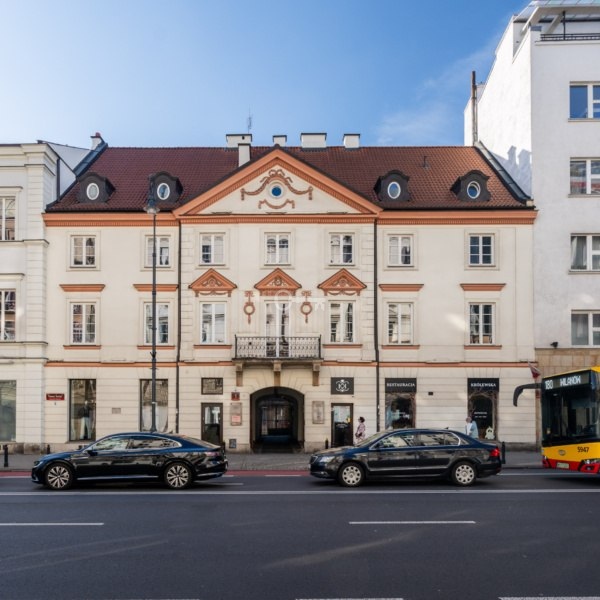The Andrzej Stroński Tenement House is a classicist palace tenement house built by Andrzej Stroński, adjacent to the tenement house on the corner of Nowy Świat and Plac Trzech Krzyży. Its history dates back to the 18th century, when it was immortalized in a watercolor painting by Zygmunt Vogel from 1784. Over the years, the tenement house has housed numerous shops, pastry shops, and editorial offices, being an important point on the cultural and commercial map of Warsaw. In the interwar period, Warsaw writers, among others, used to meet here. After being burned down during the Warsaw Uprising, the tenement house was renovated in 1947-1948, retaining its unique character.