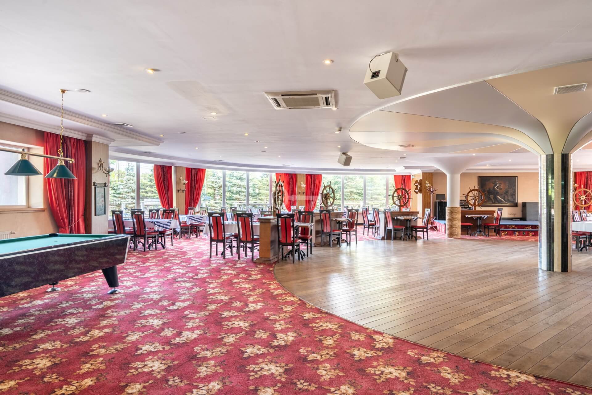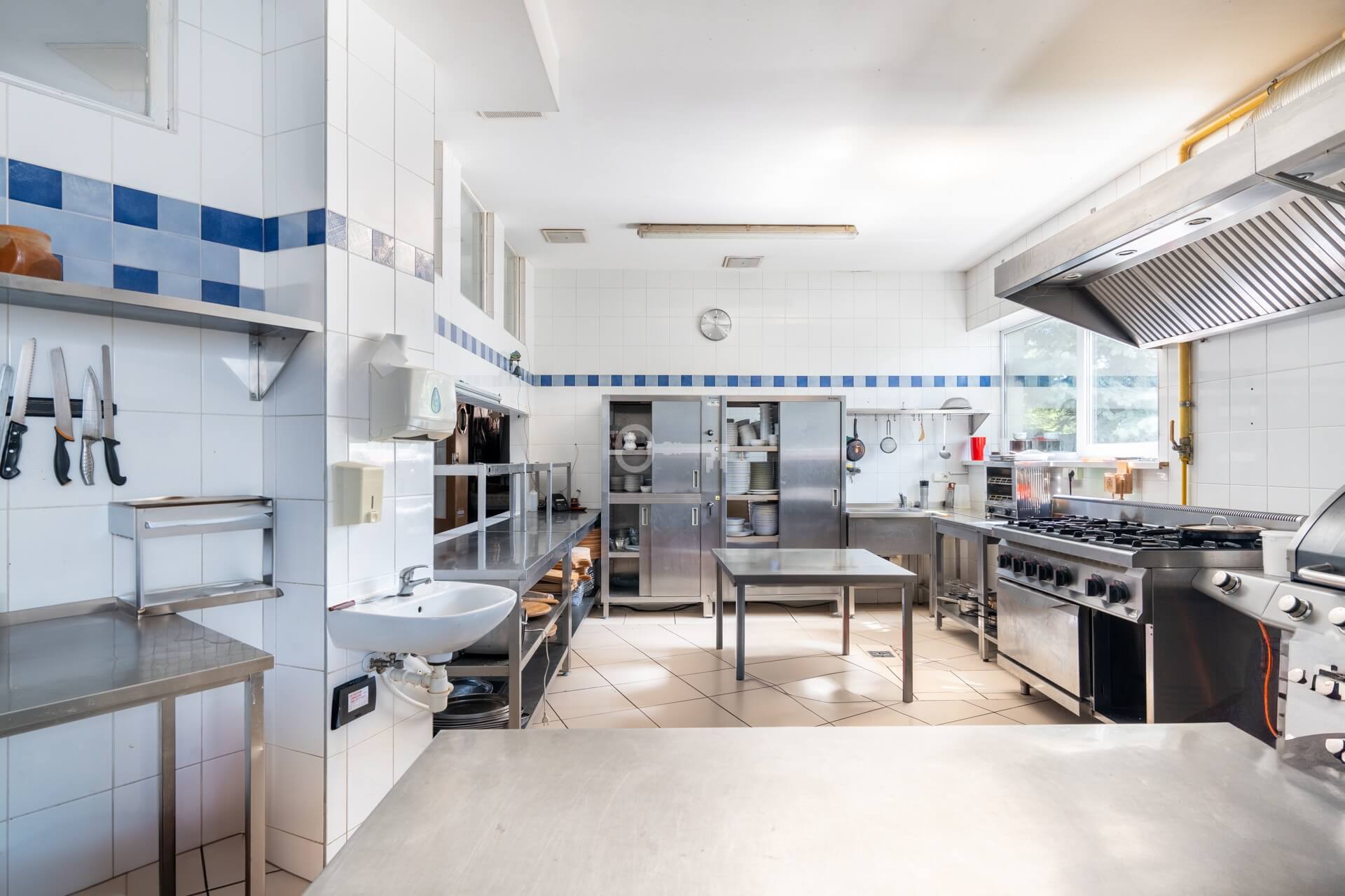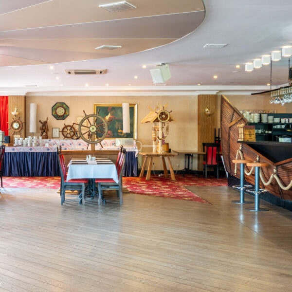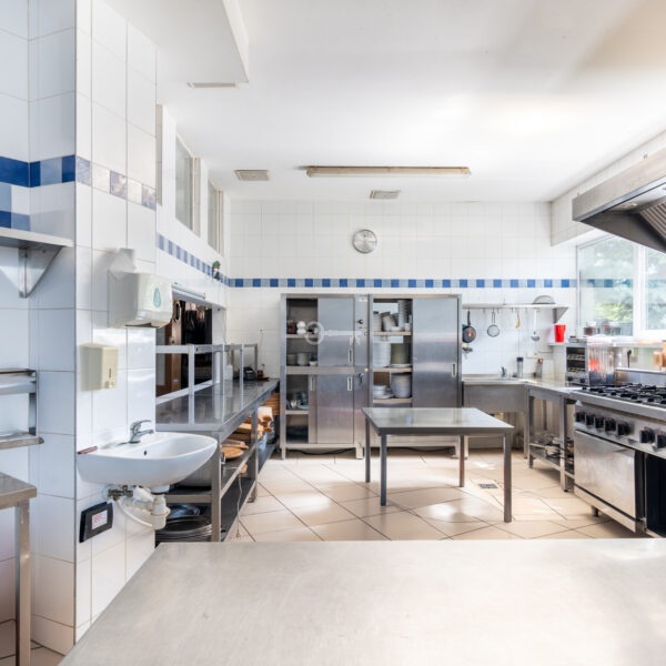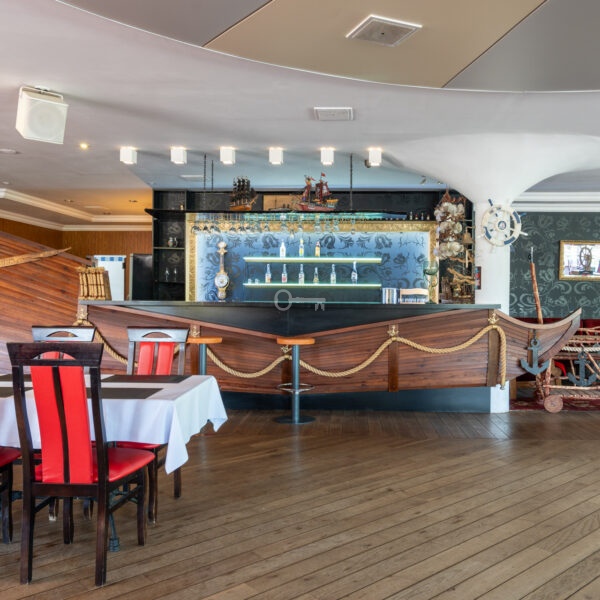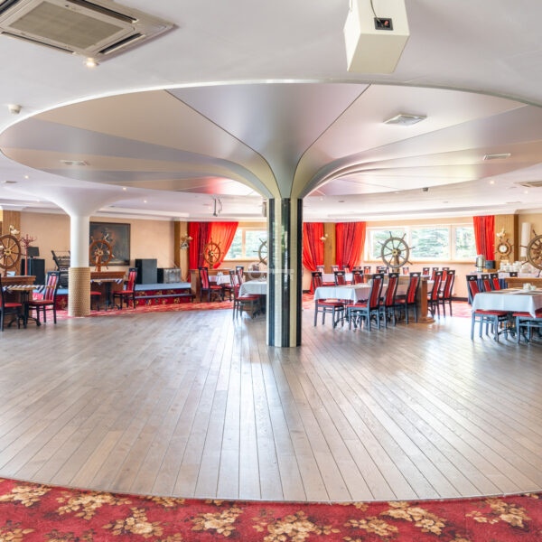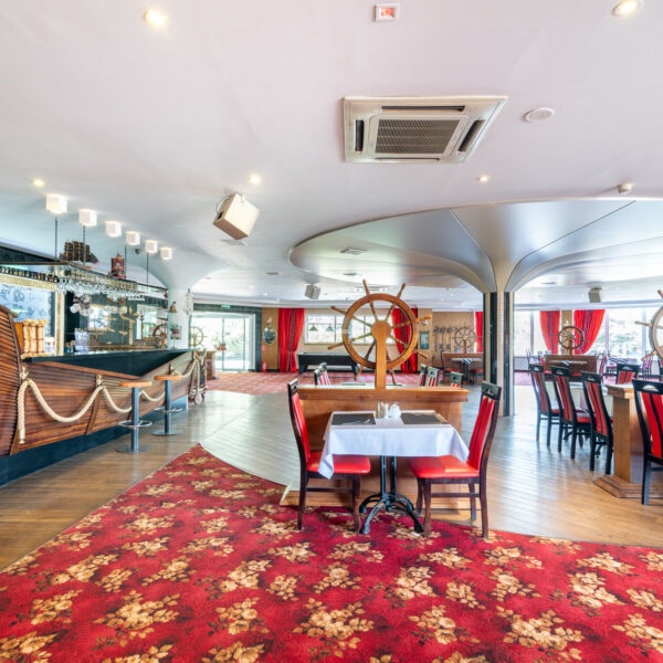 On the ground floor, there is a restaurant with a fully equipped kitchen and sanitary facilities, storage rooms, a boiler room, a lobby with a reception area, an office, and an outdoor terrace. The total area of this floor is 701 m². The restaurant is fully prepared to welcome guests.