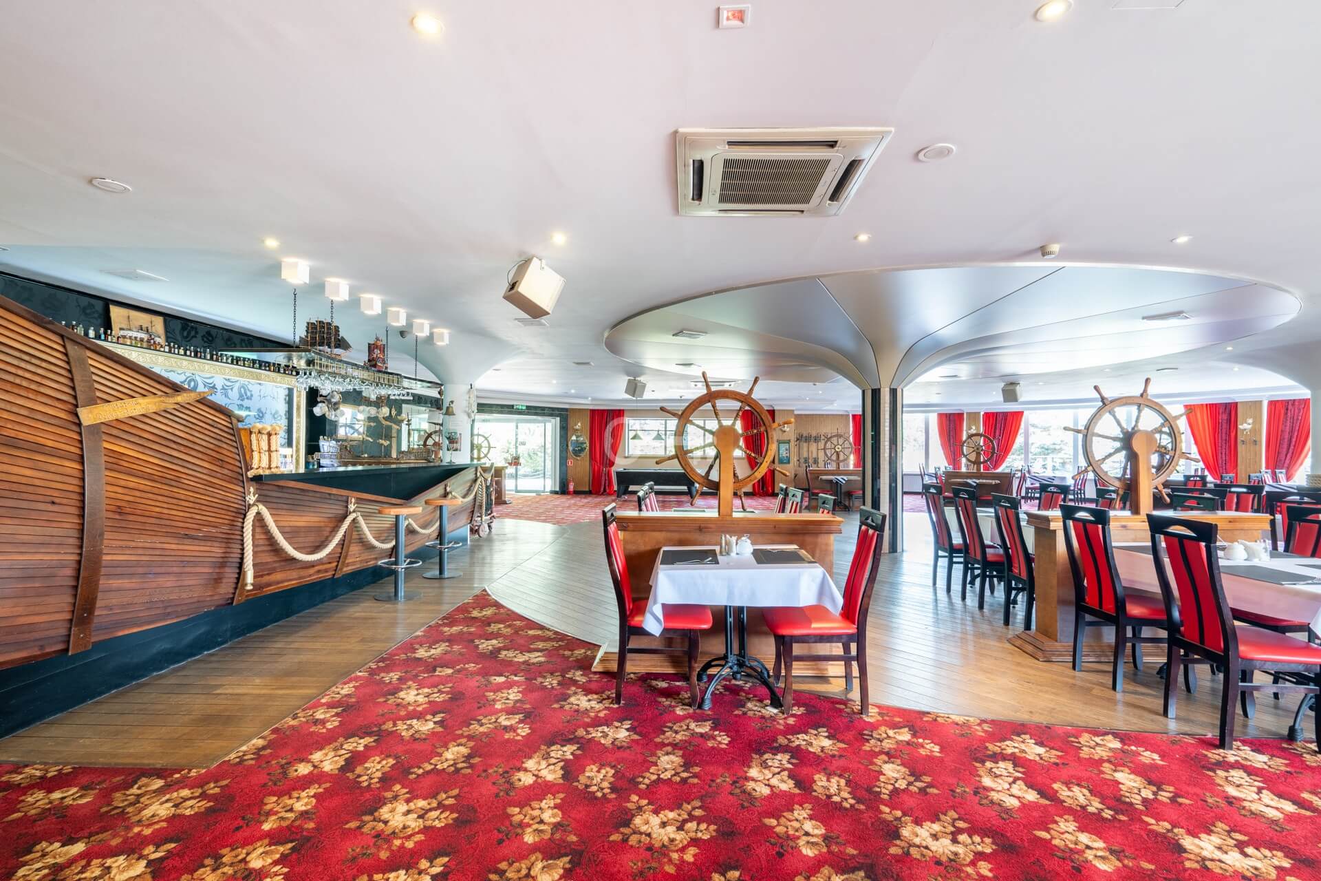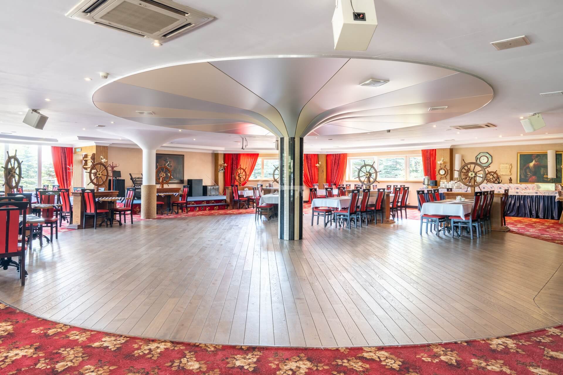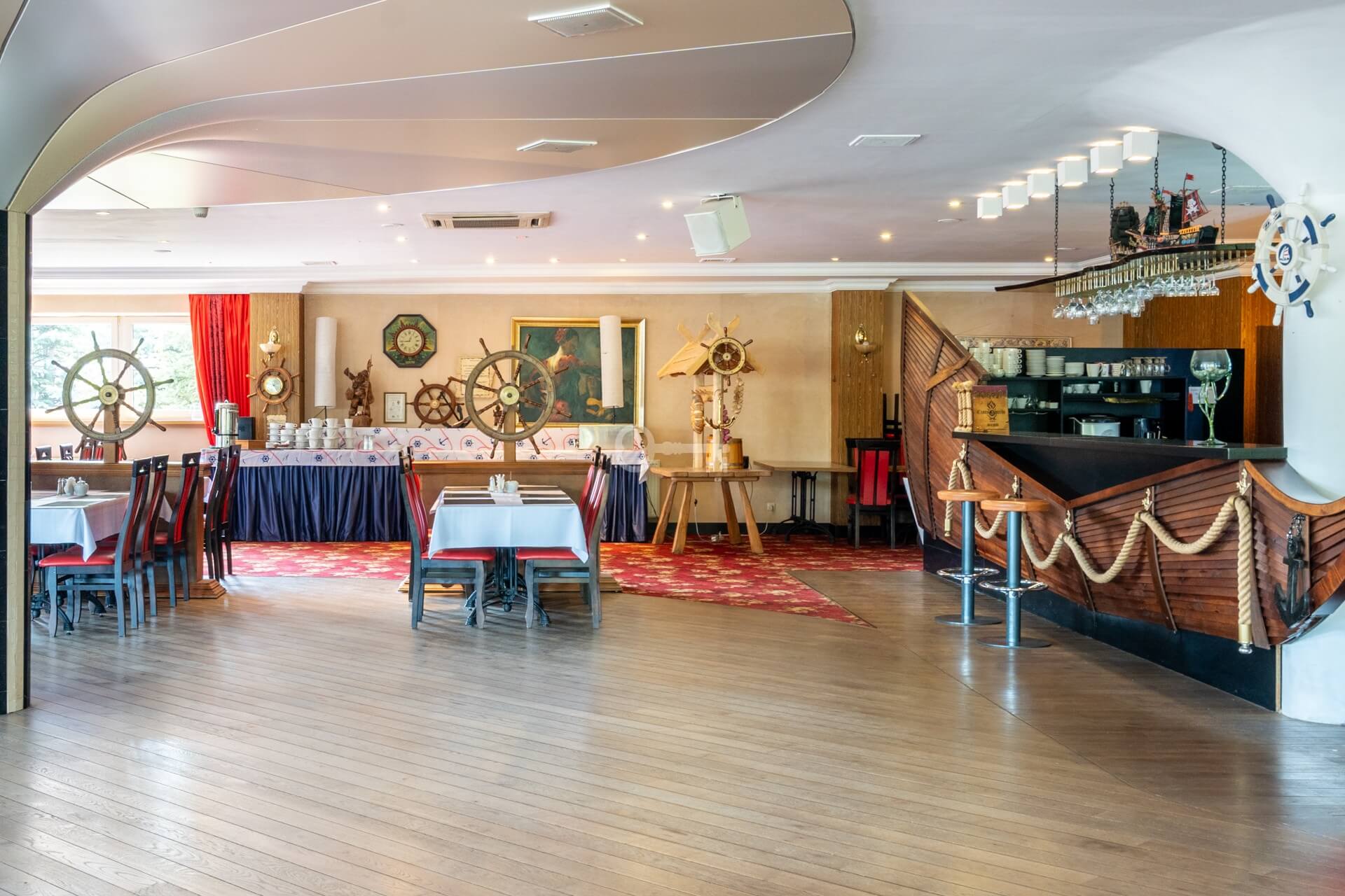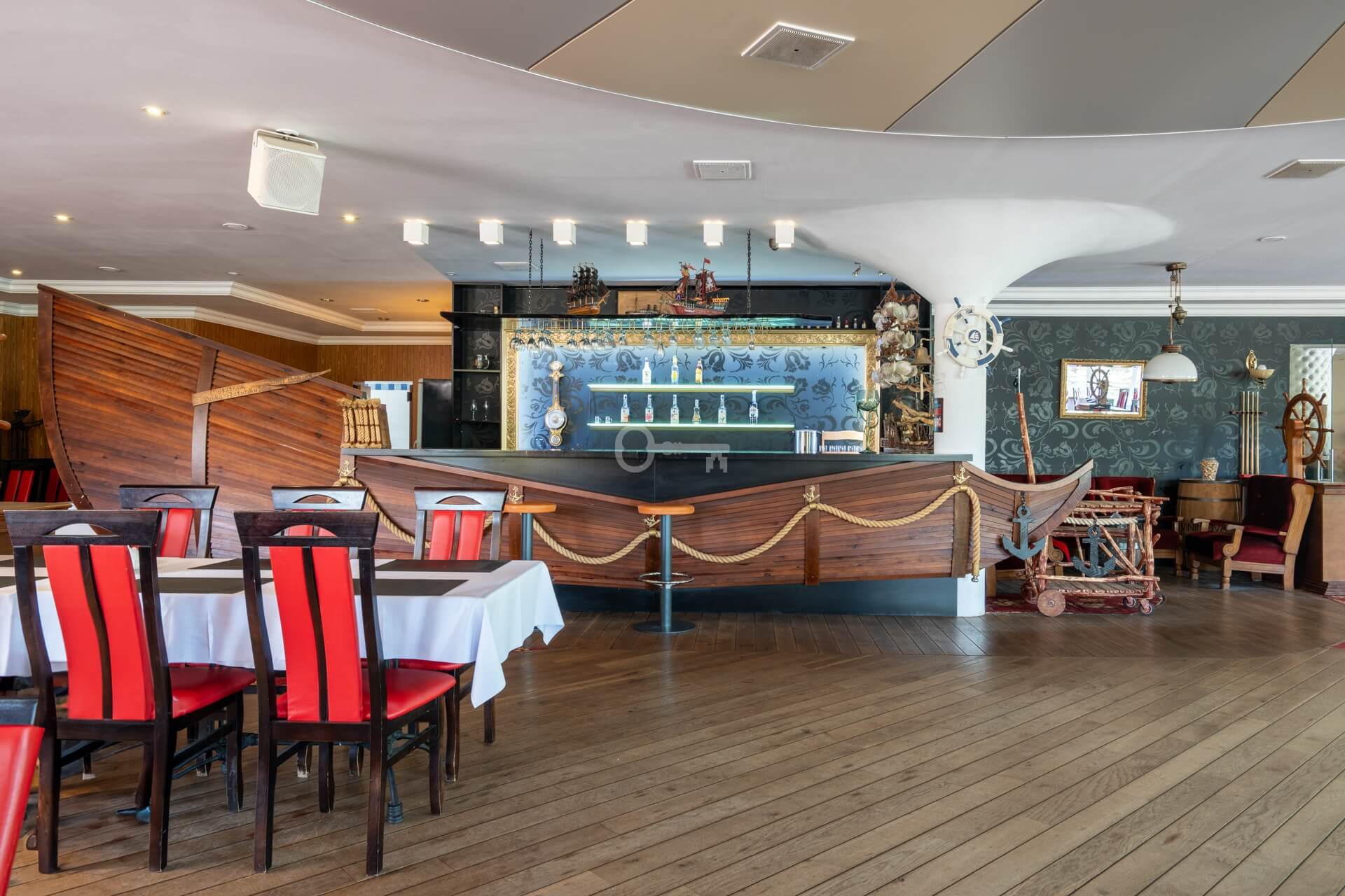 On the ground floor, there is a restaurant with a fully equipped kitchen and sanitary facilities, storage rooms, a boiler room, a lobby with a reception area, an office, and an outdoor terrace. The total area of this floor is 701 m². The restaurant is fully prepared to welcome guests.