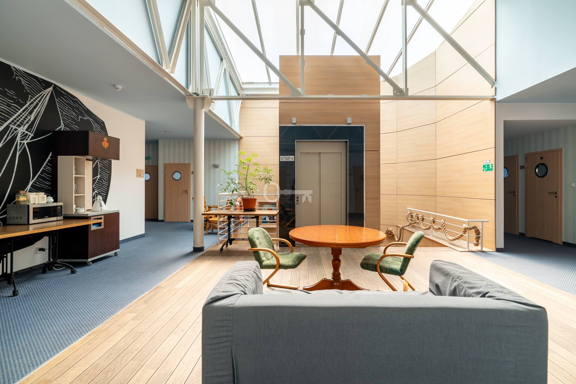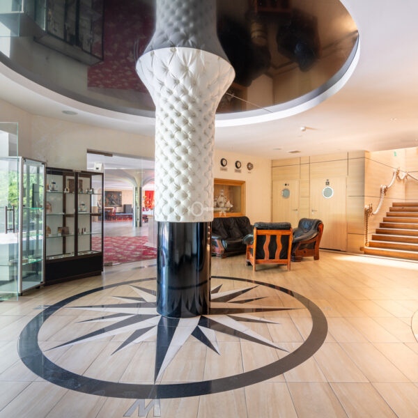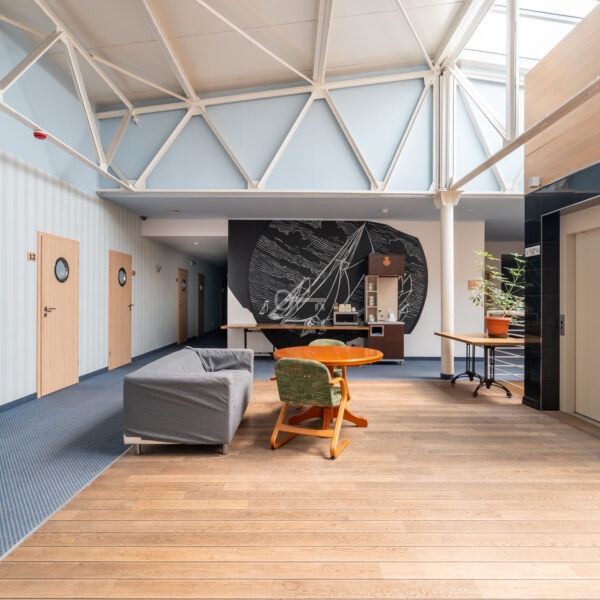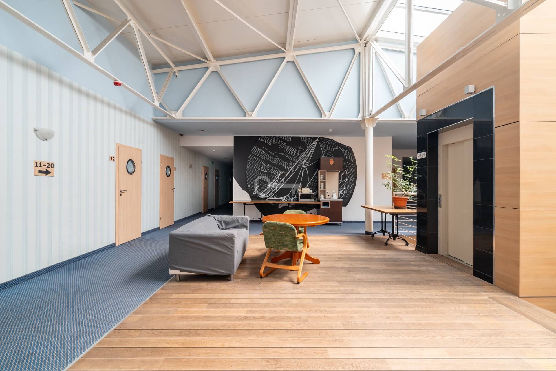 The first floor comprises 21 fully adapted hotel rooms, including two- and three-room options, as well as two apartments. There is also a conference room in the hotel. The total area of the second floor is 646 m².