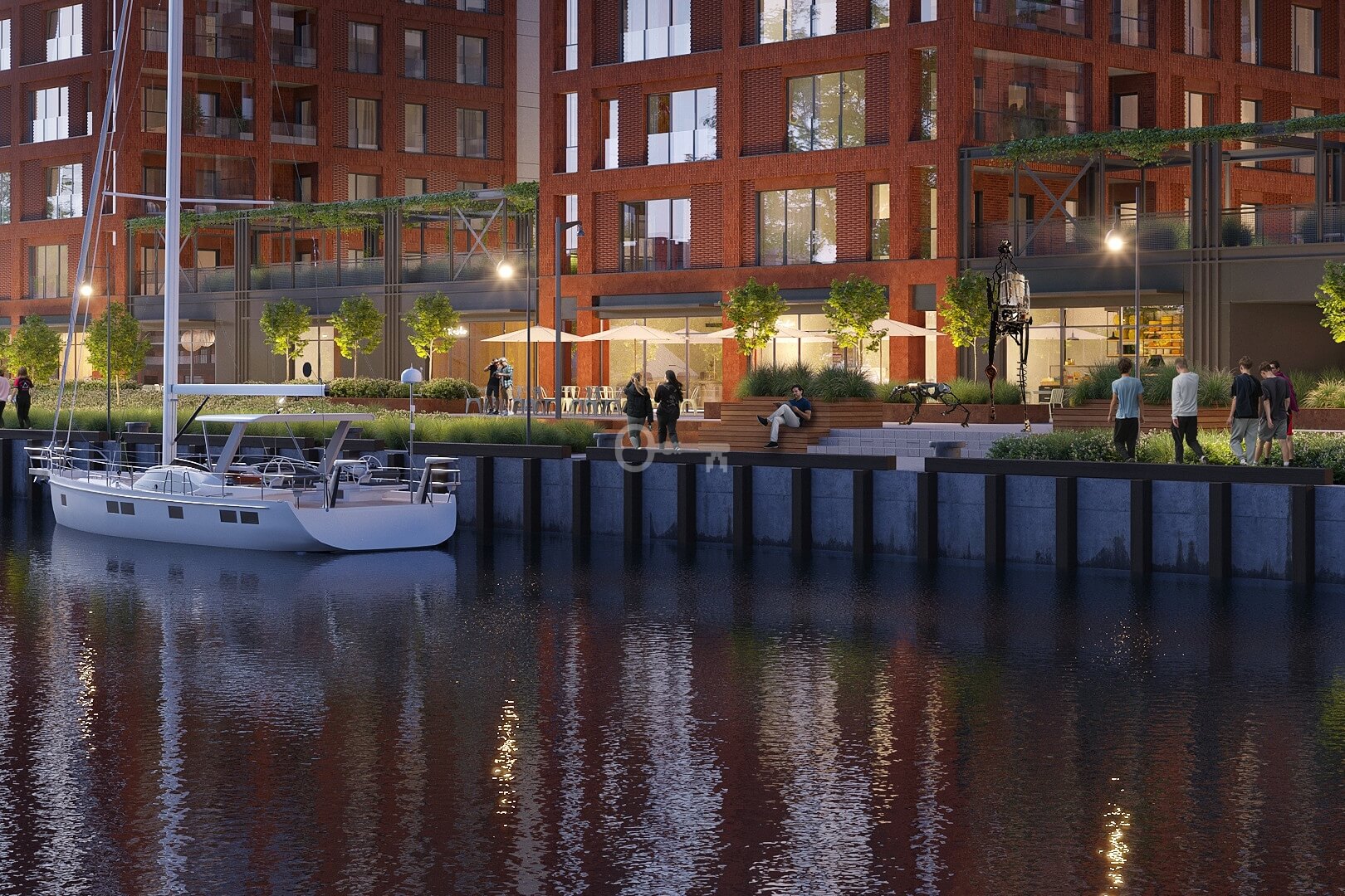 Along the river, between the buildings and the waterfront, an elegant pedestrian and cycling boulevard is planned, enriched with thoughtfully designed greenery and artistic elements highlighting the unique character of this location.