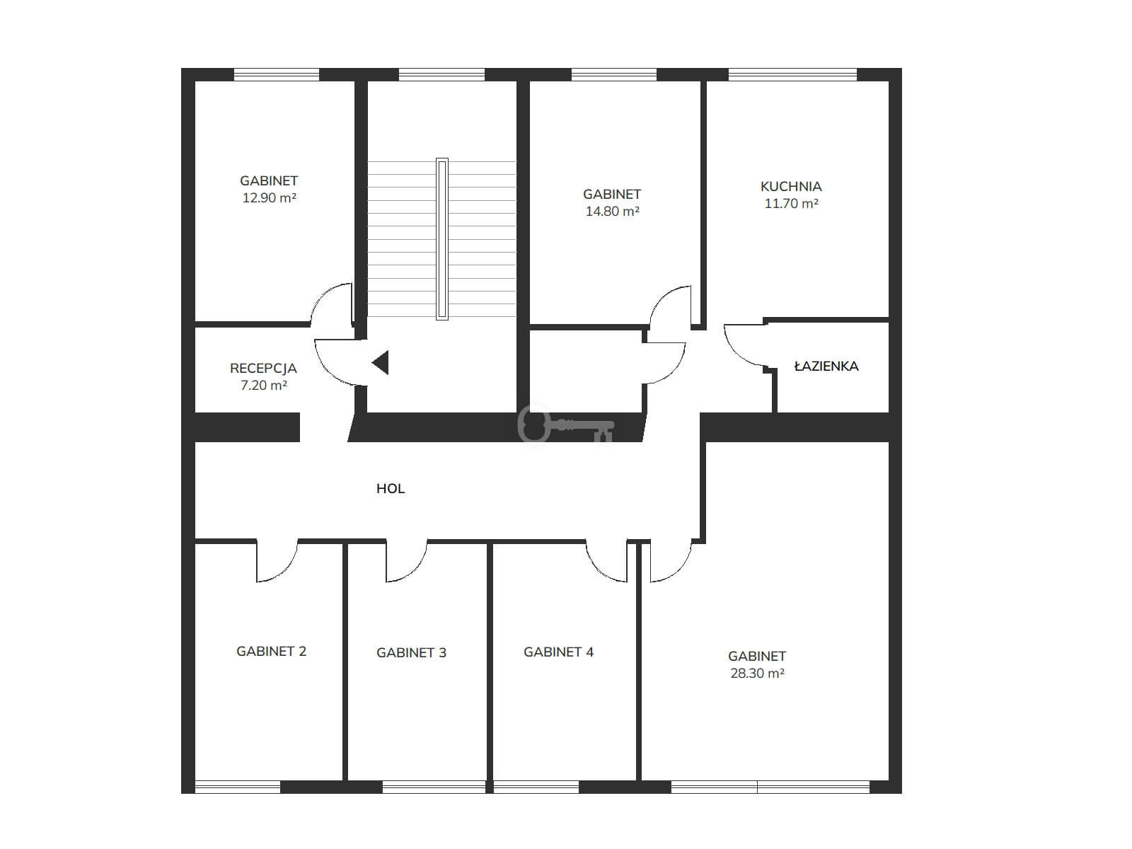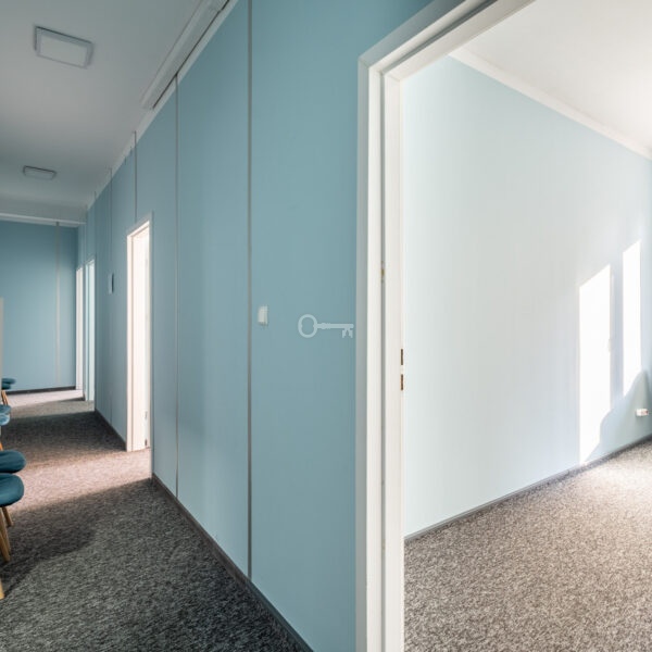 To ensure the comfort of work and meetings, air conditioning has been installed in the premises. The layout of six independent rooms allows for the free arrangement of space for individual work, while ensuring discretion and peace. The social area includes kitchen facilities and a bathroom.