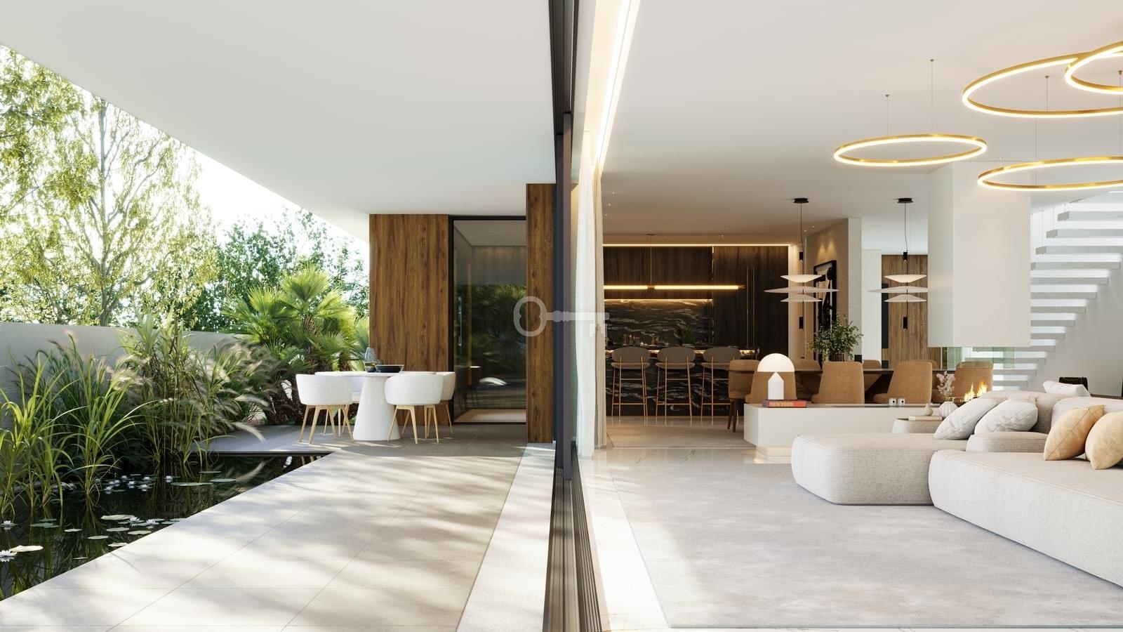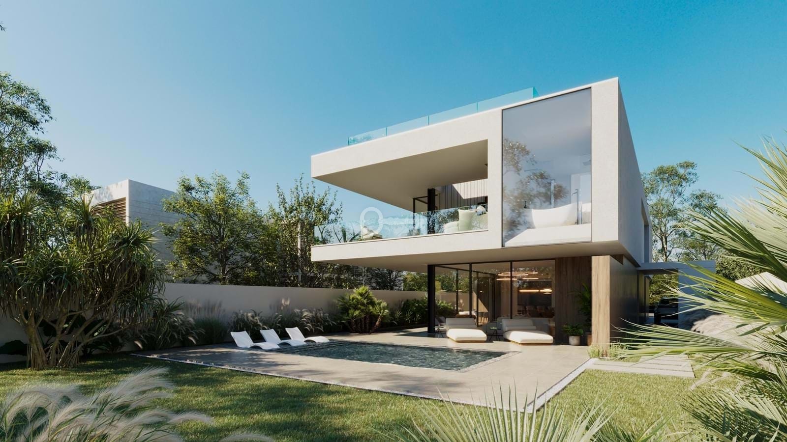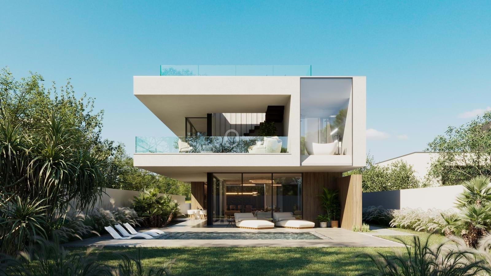 The architecture emphasizes seamless indooroutdoor living, featuring a private garden and swimming pool, spacious living areas, and a 67 m² balcony on the first floor ensuring comfort, functionality, and abundant natural light.