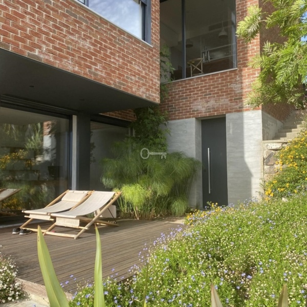 The house boasts beautiful views of the city and the sea, benefiting from an east-west orientation that provides exceptional brightness in all rooms. The charming garden, filled with fruit trees, offers the possibility of installing a pool, perfect for family leisure time.