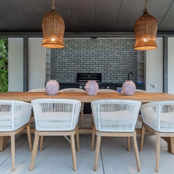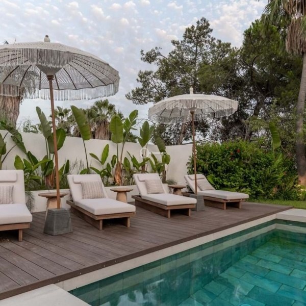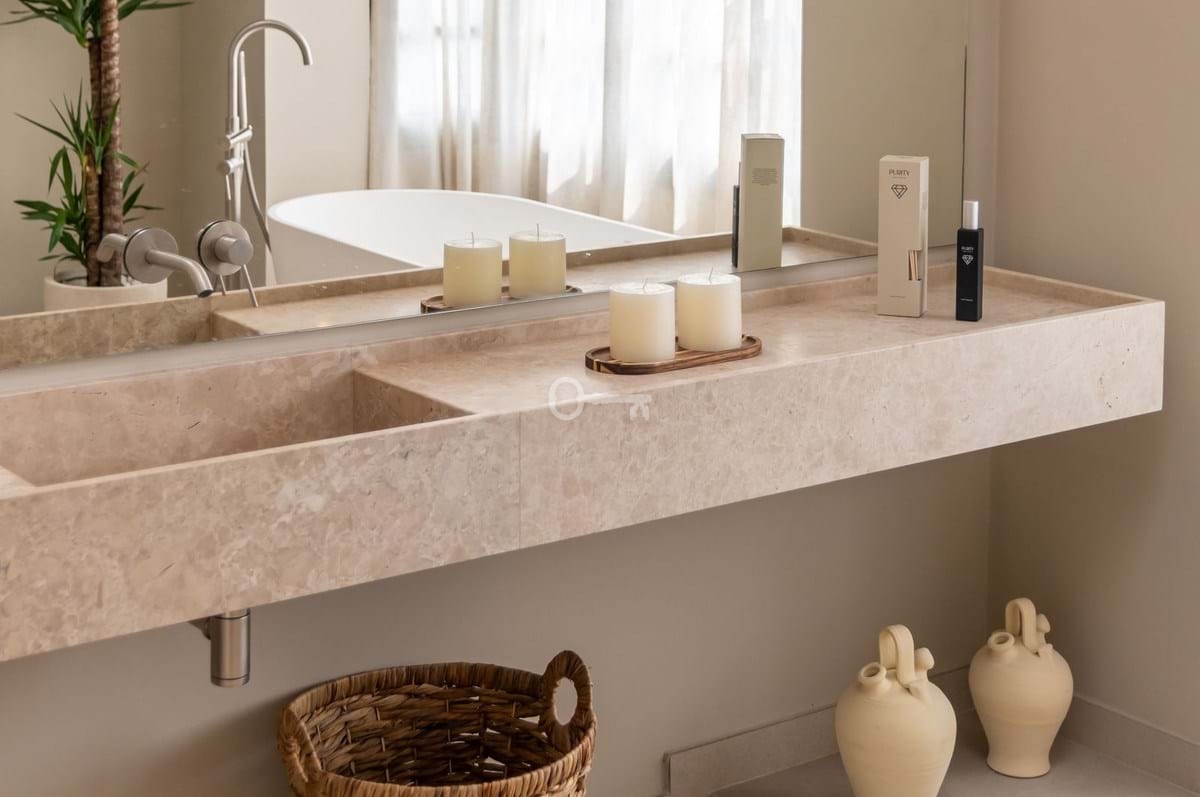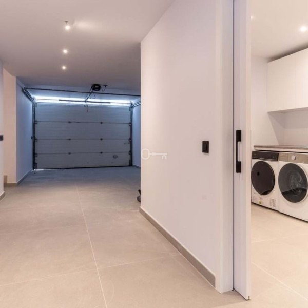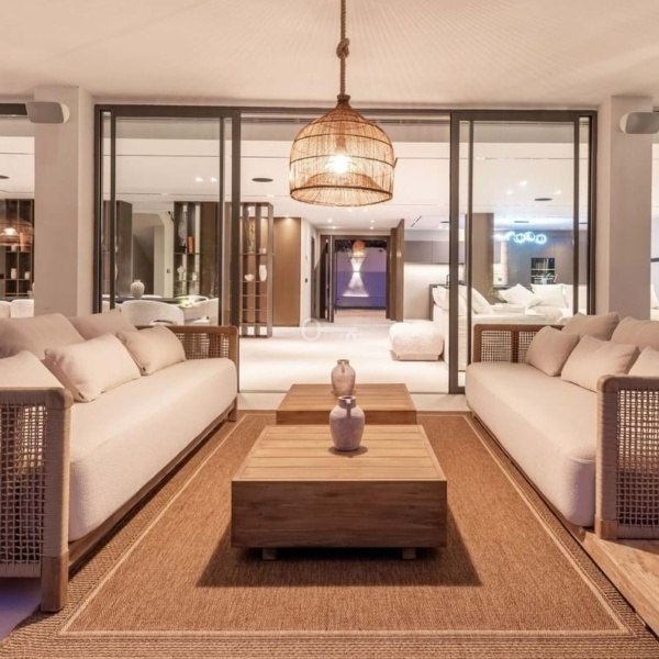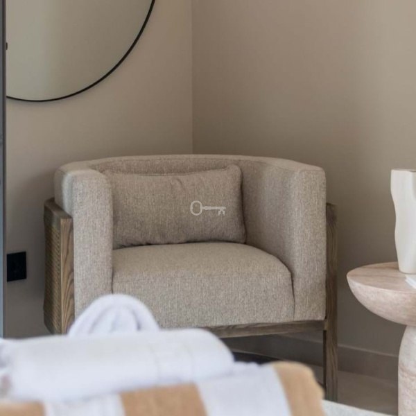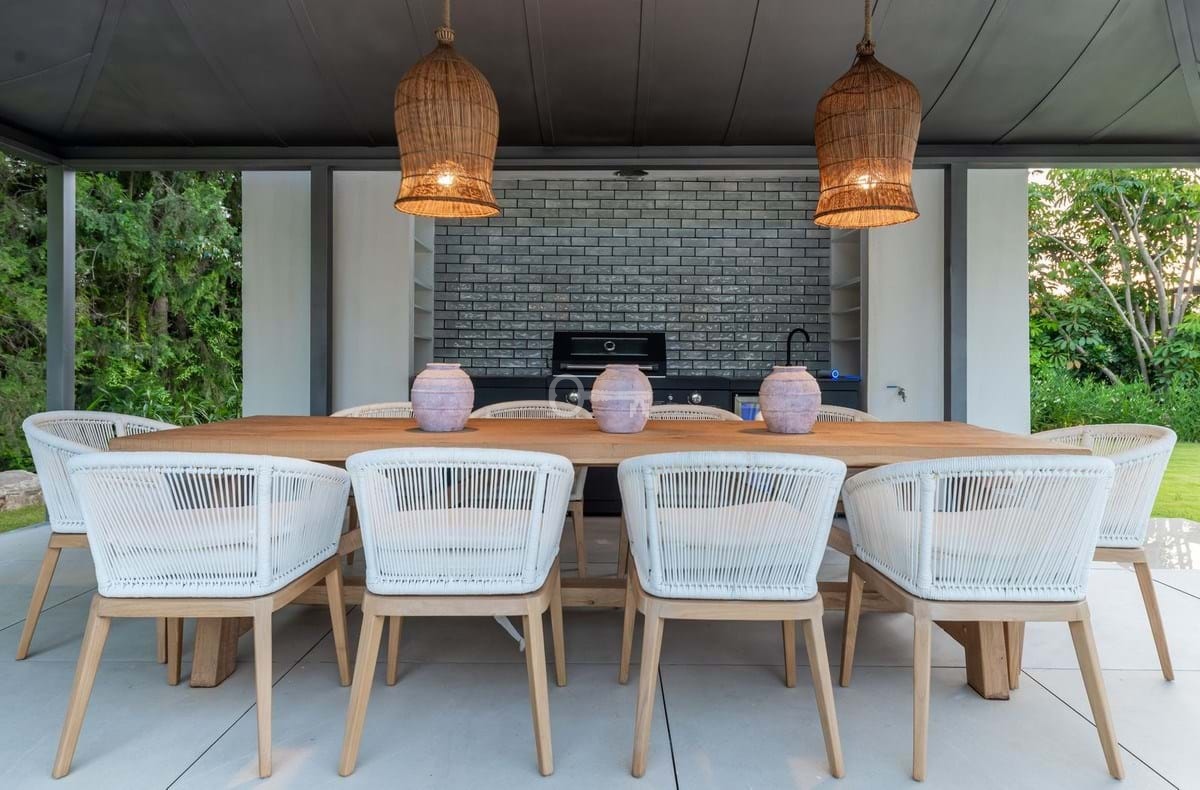Inside, the atmosphere is warm and inviting, with modern finishes softened by natural wood accents. The open-plan kitchen and dining area flow seamlessly, with the kitchen fitted with high-quality Siemens appliances for those who love to cook. The living space opens directly onto a charming chill-out terrace, perfect for unwinding with friends or enjoying a quiet evening. Every corner of the home has been designed with comfort and hospitality in mind. Interior & exterior furniture by KOA Interior.