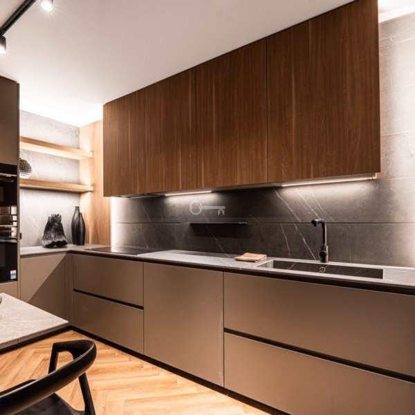 The kitchen is fully equipped and designed for both practicality and aesthetics, harmoniously blending with the overall interior design.