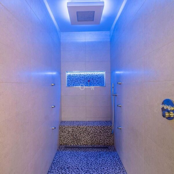 The house consists of three floors, accessible via elevator or floating stairs, and has a beautiful, spacious double-height entrance hall. Large sliding windows integrated into the wall easily connect indoor and outdoor living. You can enjoy incredible panoramic sea views from almost anywhere in the villa.