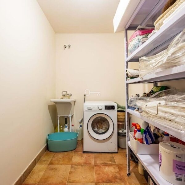 This level also provides access to the laundry area and the propertys private garage, adding further practicality and convenience.