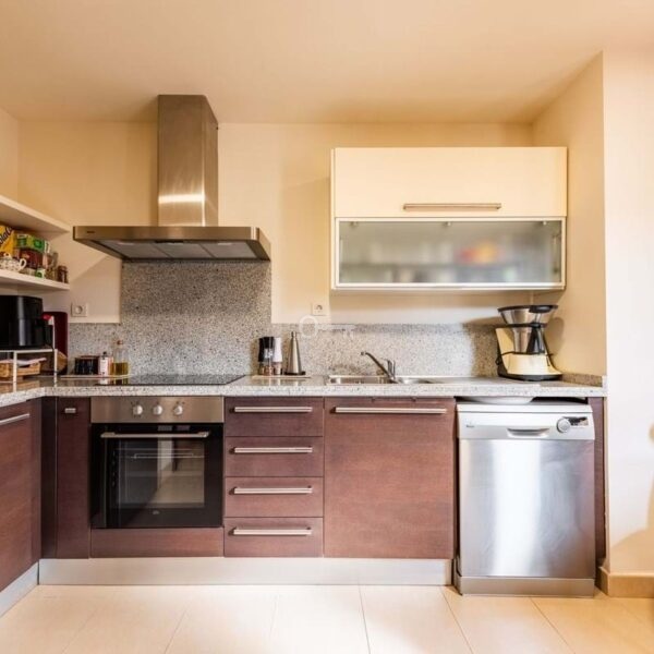 The fully equipped kitchen benefits from large windows overlooking the terrace, allowing for abundant morning natural light and creating a bright and pleasant space for everyday living.
