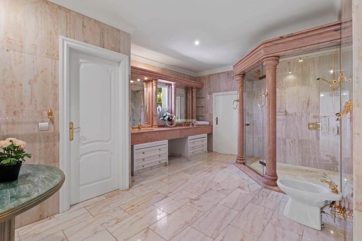 The exterior is a true Mediterranean retreat, with a lush, mature garden and water features surrounding a large private pool, complete with shower area, outdoor bathroom, and a fully equipped summer kitchen with BBQ, ideal for entertaining and enjoying the Costa del Sol climate. The property also includes a covered garage and additional on-site parking.