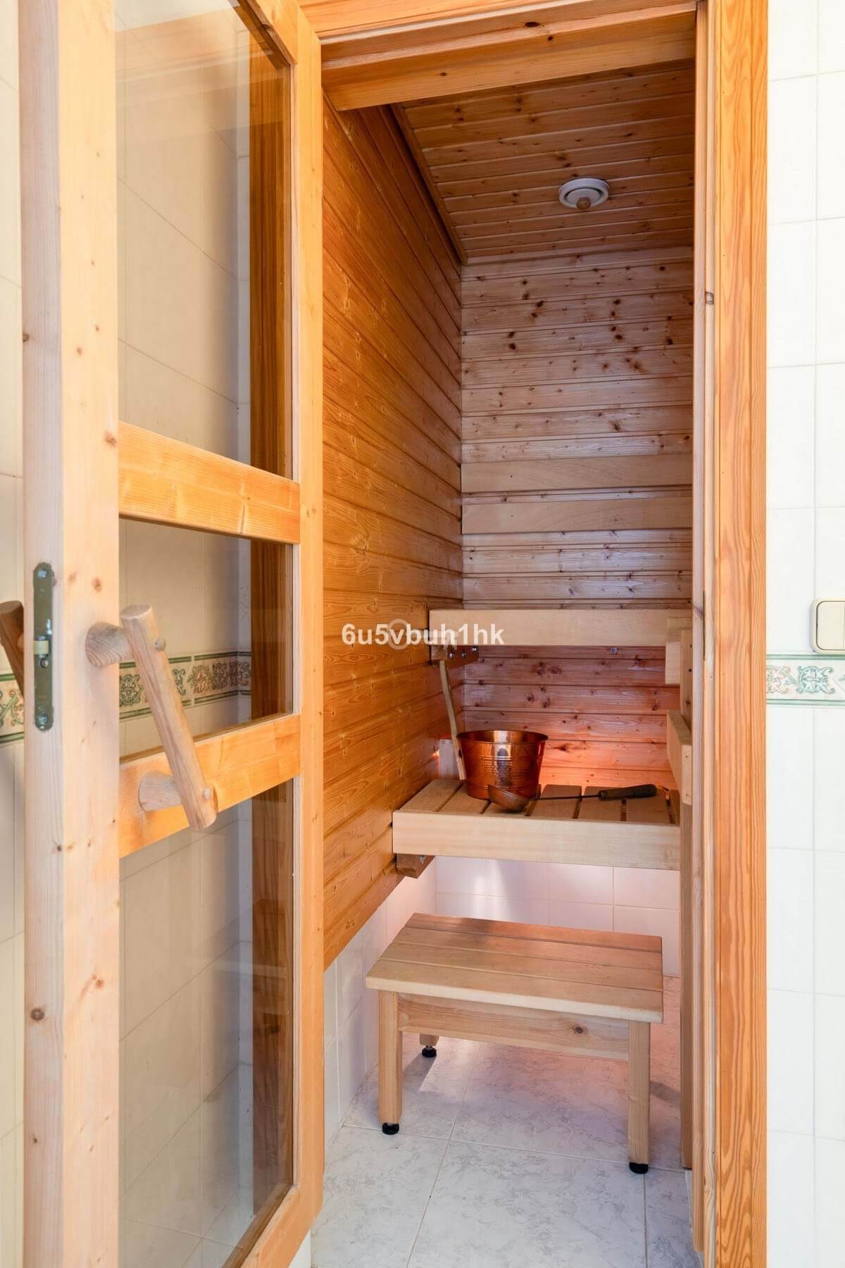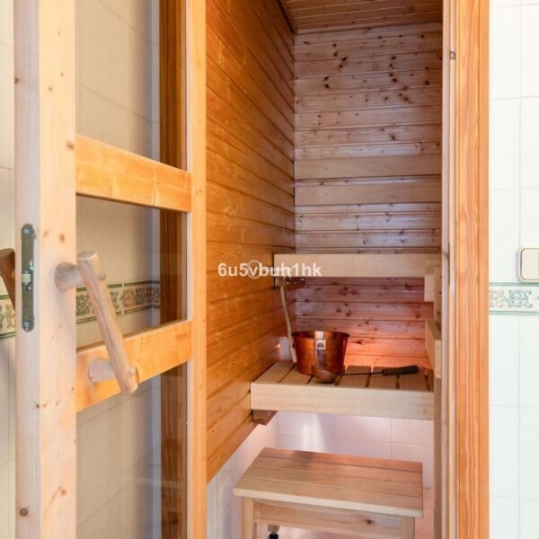 The lower floor offers two additional bedrooms, a bathroom, a laundry room and a private sauna. From here, there is access to a back patio, which can also be used as private parking.
