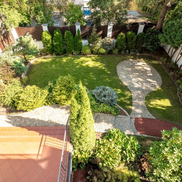 * recreational garden at the back in a cascading style – terraces, lawn and flower beds,