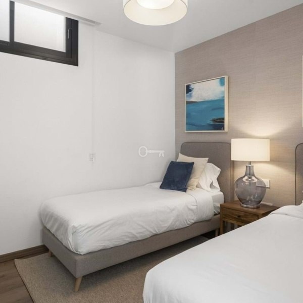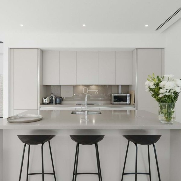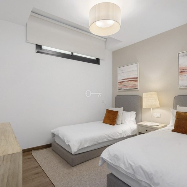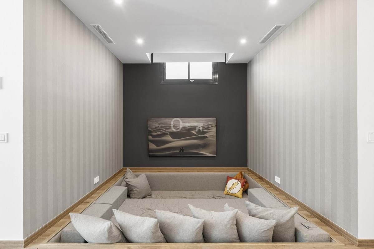 The ground floors contemporary kitchen allows for sociable cooking experiences, with easy interaction across the open-plan living spaces. The lower level features two bedrooms sharing a bathroom, cleverly designed to benefit from ample natural light and fresh air. This level also includes a dedicated TV lounge, perfect for quiet evenings or family entertainment.