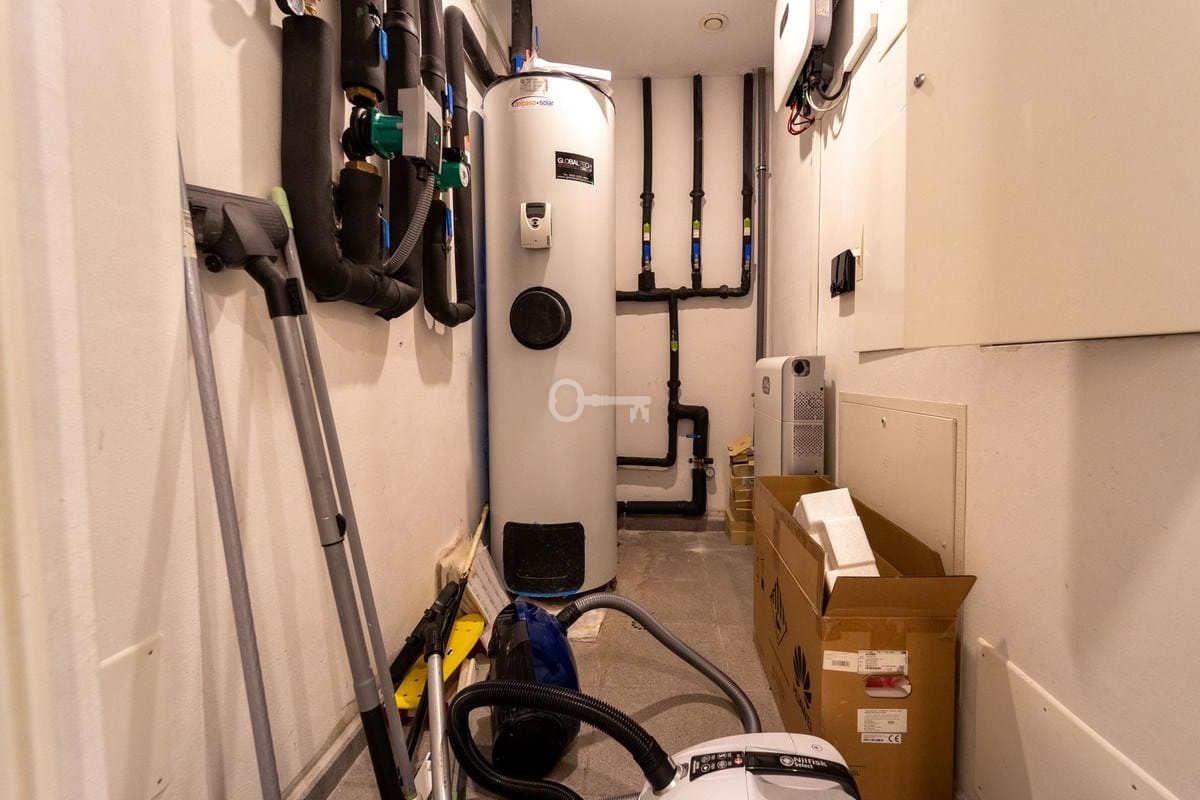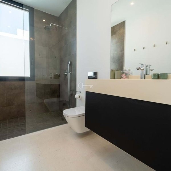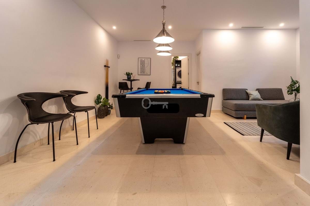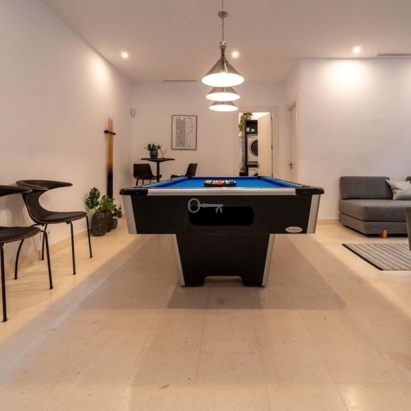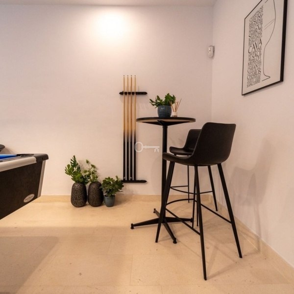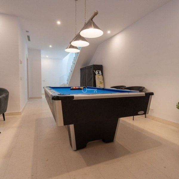 The lower floor leads to the garage which has independent access and is ideal for storing a golf buggy. This level provides two further double bedrooms with natural light coming from patios above and a fully fitted bathroom with laundry machines. There is also a cosy lounge area equipped with a pool table and room to watch television, movies or sport. The villa has 2 private parking spaces and a storage room.