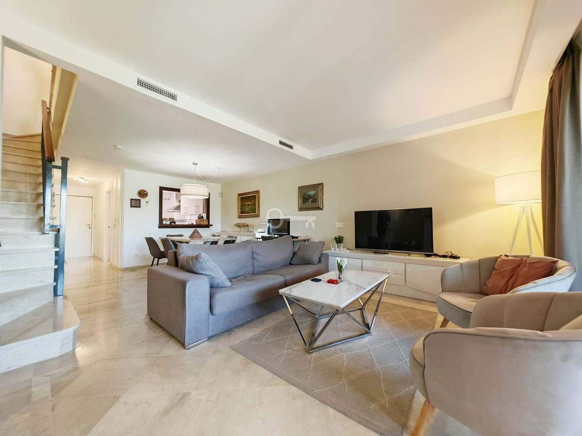 Town House for sale in Cabopino, Marbella with 3 bedrooms, 2 bathrooms, 2 en suite bathrooms, 1 toilet and with orientation south, with communal swimming pool, private garage and private garden. Regarding property dimensions, it has 304.22 m² built and 135.56 m² plot. Has the following facilities front line golf, transport near, air conditioning, fully fitted kitchen, fireplace, marble floors, satellite tv, basement, alarm, solarium, security entrance, double glazing, video entrance, barbecue, telephone, guest toilet, private terrace, living room, sea view, golf view, smart home system, internet – wi-fi, covered terrace, electric blinds, fitted wardrobes, garden view, pool view, panoramic view, street view, close to sea / beach, close to golf, uncovered terrace, glass doors, optional furniture, excellent condition, recently renovated / refurbished, ceiling cooling system, saltwater swimming pool, close to shops, close to port, surveillance cameras and pets allowed.