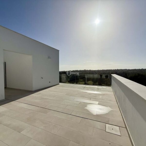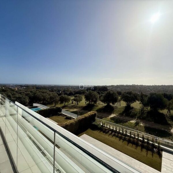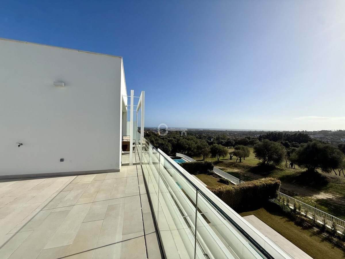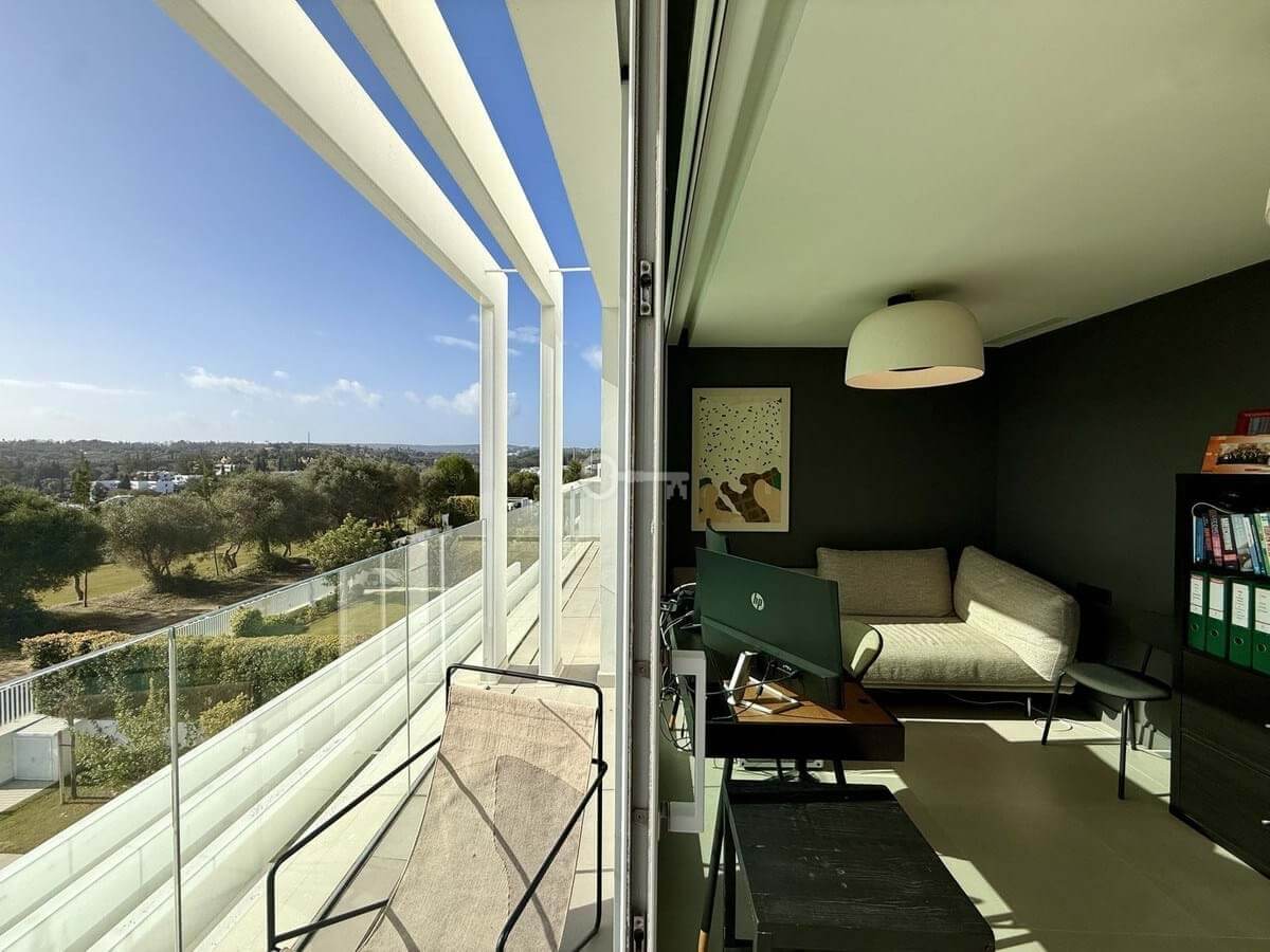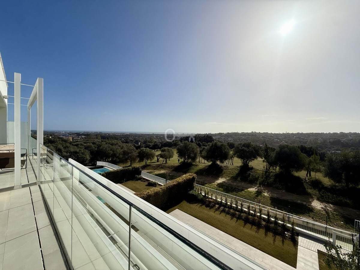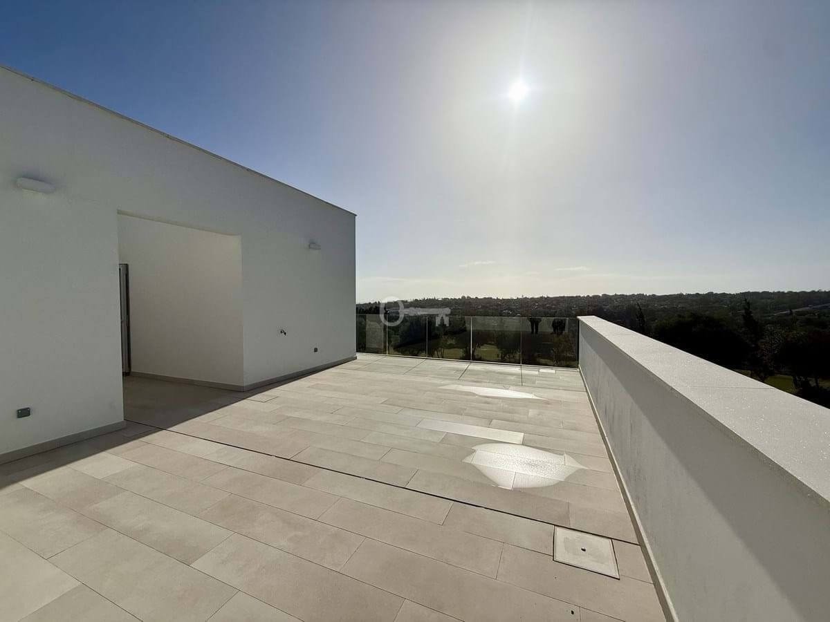 The upper floor hosts a bright and versatile fifth room, currently used as an office, with a separate bathroom and access to a generous rooftop terrace. From here, panoramic views extend over the golf course and towards the sea, making it an ideal space for outdoor dining, relaxing or the installation of a private spa.