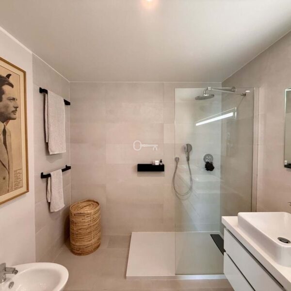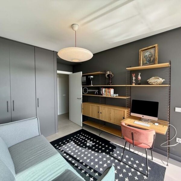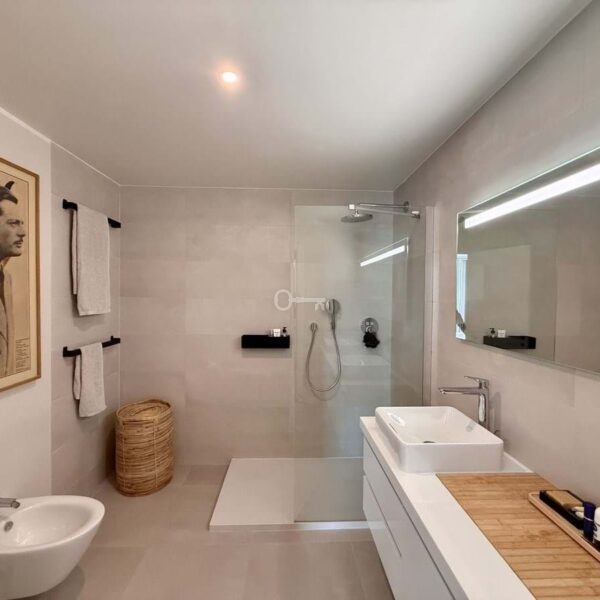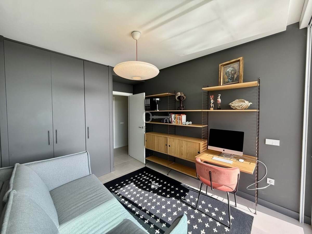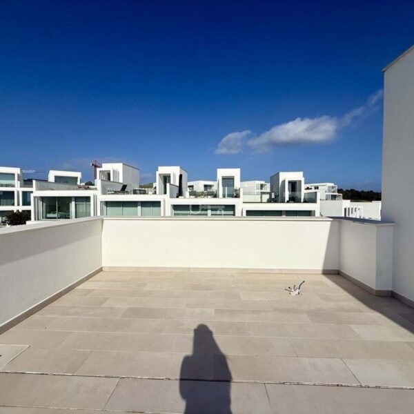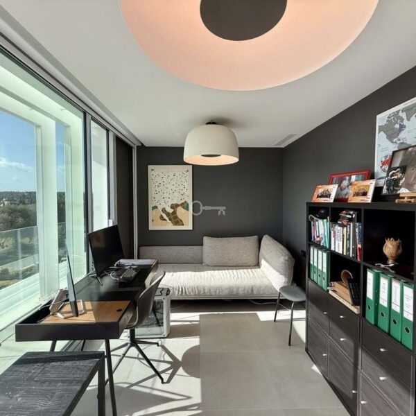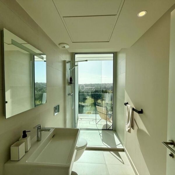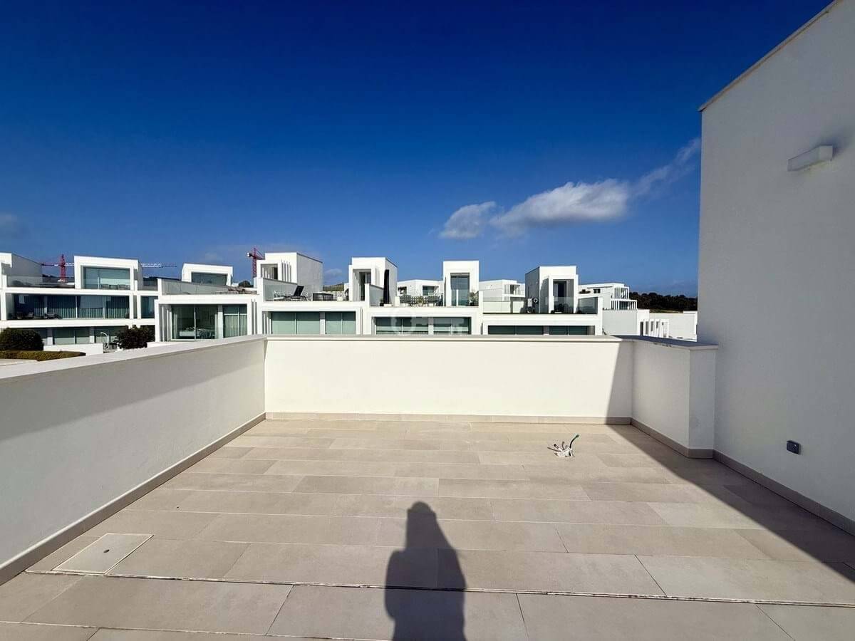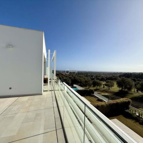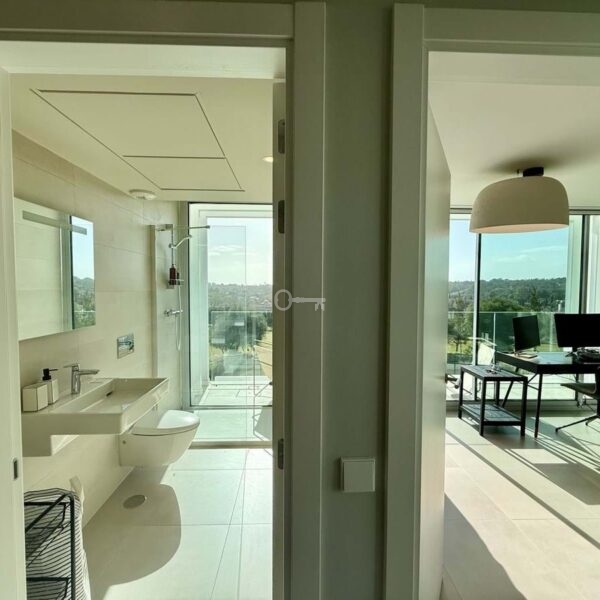 The upper floor hosts a bright and versatile fifth room, currently used as an office, with a separate bathroom and access to a generous rooftop terrace. From here, panoramic views extend over the golf course and towards the sea, making it an ideal space for outdoor dining, relaxing or the installation of a private spa.