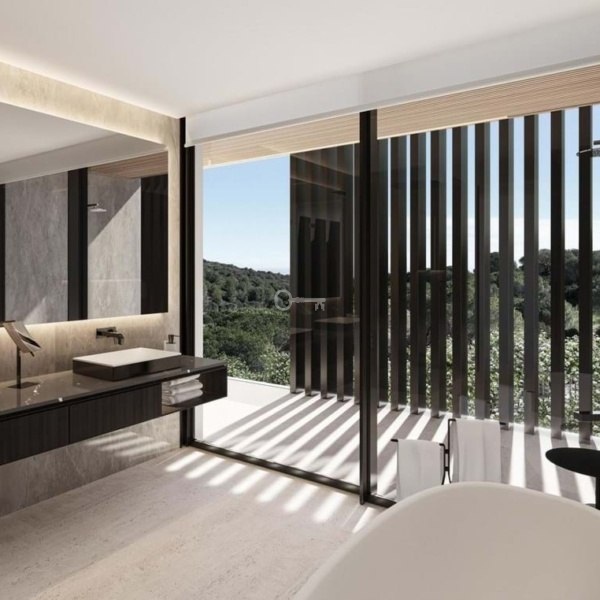 Upstairs, the villa offers four beautifully appointed en-suite bedrooms, each enjoying panoramic views over the surrounding landscape. The master suite is a true retreat, featuring a luxurious bathroom and a private dressing room, providing the ultimate in comfort and privacy.