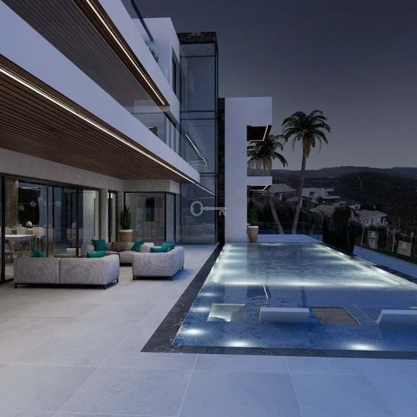 Perched in one of Sotograndes most prestigious elevated locations, Villa Edge redefines luxury living through bold architecture and one-of-a-kind design elements found nowhere else in the resort. From the moment you pass through its bespoke private gates, youre met with a dramatic entrance a sweeping driveway guiding you to either a sleek carport or an illuminated 5-car gallery-style garage, designed as much for showcasing as for parking. Natural light pours in through glass panels beneath the feature pool above, while custom LED displays highlight each vehicle like art.