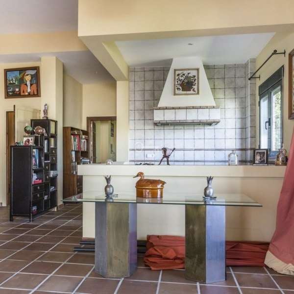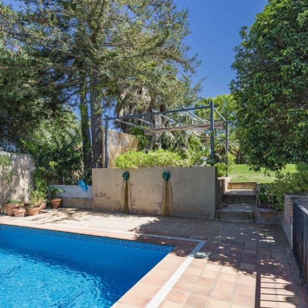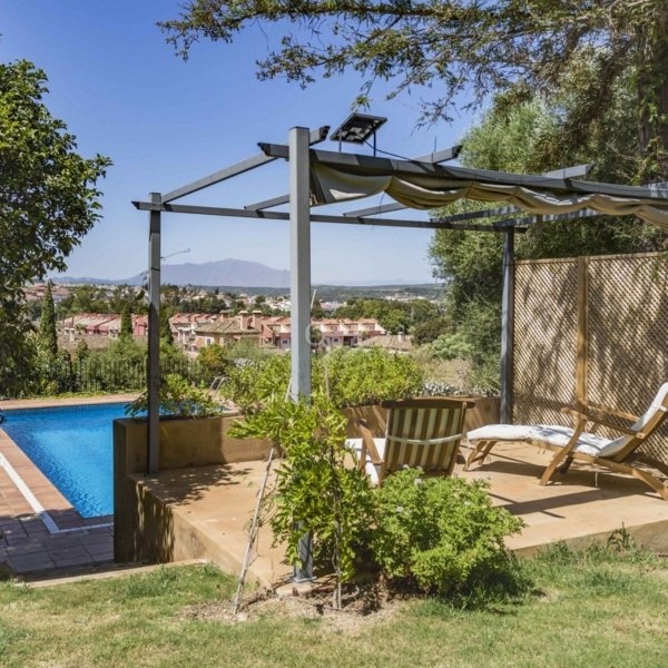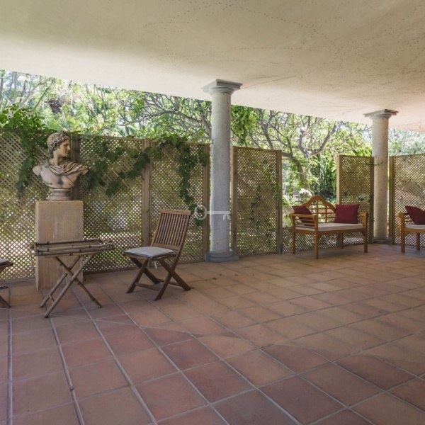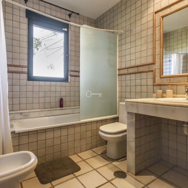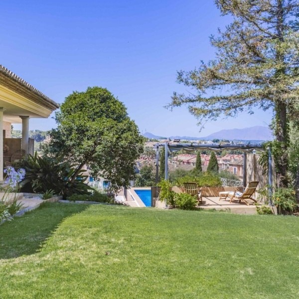 Detached two-story villa in the coastal area of Sotogrande. On the first floor, we find a spacious entrance hall leading to 3 large bedrooms, a kitchen, and a living room. The bedrooms have en-suite bathrooms, while another is located in the hallway. The kitchen has a pantry and a separate toilet. The bright living room opens onto a spacious L-shaped porch, which overlooks the garden and a gazebo with views of the pool and the mountains. From the entrance hall, there is also access to the lower floor, a separate area with 2 bedrooms and 2 bathrooms, as well as a kitchenette integrated into a living area with a fireplace. This floor is ideal as an independent apartment, as it also has access through the garden or garage (with capacity for 4 cars). The garden has a charming and modern bathroom with a shower, perfect for use when swimming in the pool. Air conditioning and central heating are available. The property is conveniently located, a 5-minute drive from supermarkets and the Paniagua shopping center, and is also a very quiet area. The property was partially renovated in 2024.