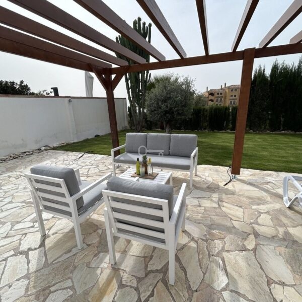 Ground Floor: Three bedrooms, one of them with an en-suite bathroom (shower) and direct access to the covered terrace, pool, and garden. The other two bedrooms have access to the terrace, pool, and garden, and share a bathroom with a bathtub.