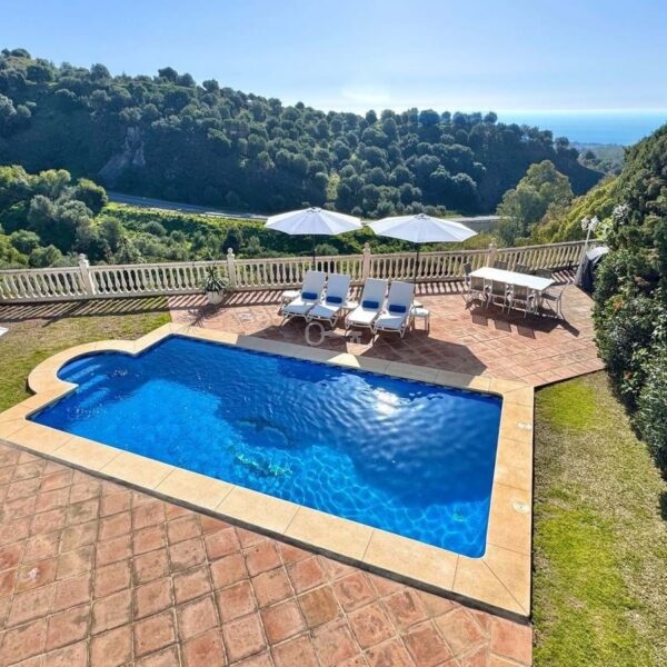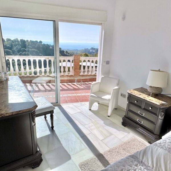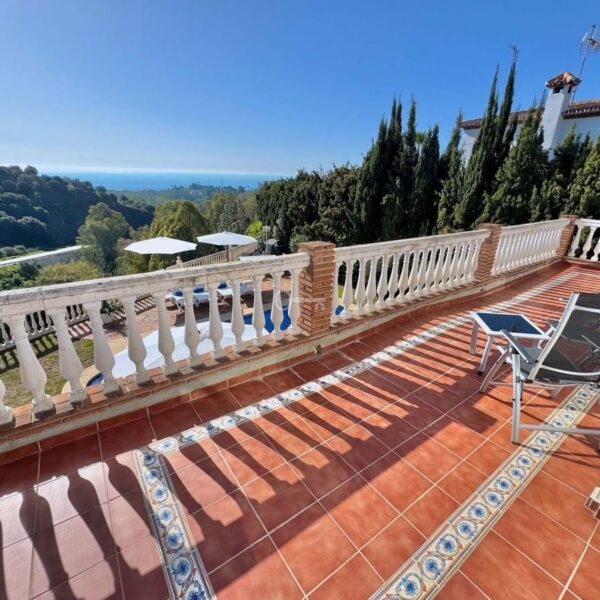 New Listing – Lovely 5 bed, 3.5 bath Villa on elevated plot in Upper Calahonda, offering beautiful panoramic views over tree-lined hillside down to the sea.