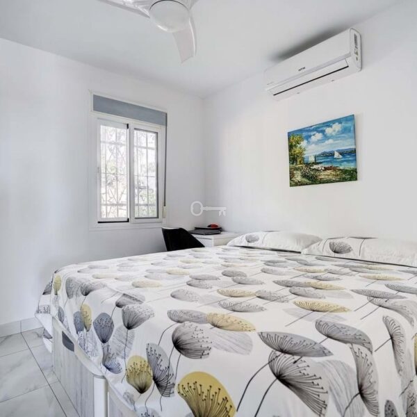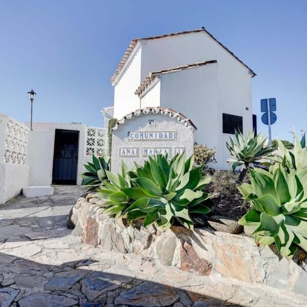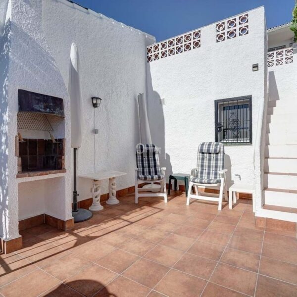 Outside, the property has a main terrace with sea views and a built-in barbecue, plus steps leading to a rooftop terrace with even wider views, power sockets, and all-day sun. The garden wraps around the bungalow and is finished with low-maintenance astro turf. There is also an exterior storage cupboard and fibre optic internet installed. The community is gated and secure and the communal gardens are well kept and spacious, with a large communal swimming pool. A shopping centre with supermarkets, pharmacy, bars, and restaurants is about a 3-minute walk away, and the beach can be reached in under 10 minutes on foot. It is offered fully furnished and includes a private garage.